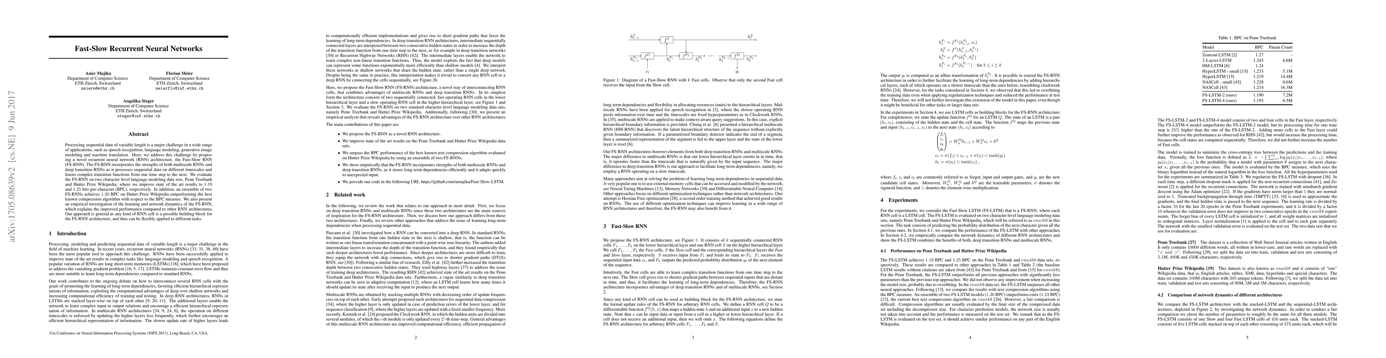 A new type of recurrent neural network (RNN) called Fast-Slow RNN is proposed to process sequential data on different timescales, improving state-of-the-art results in language modeling tasks.