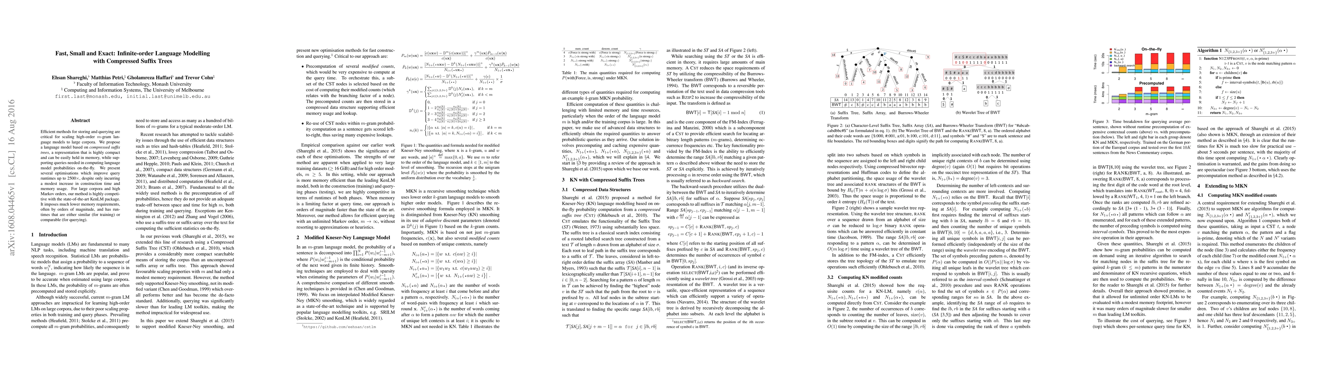 Efficient methods for storing and querying are critical for scaling high-order n-gram language models to large corpora. We propose a language model based on compressed suffix trees, a representation that is highly compact and can be easily held in memory, while supporting queries needed in computing language model probabilities on-the-fly. We present several optimisations which improve query runtimes up to 2500x, despite only incurring a modest increase in construction time and memory usage. For large corpora and high Markov orders, our method is highly competitive with the state-of-the-art KenLM package. It imposes much lower memory requirements, often by orders of magnitude, and has runtimes that are either similar (for training) or comparable (for querying).
