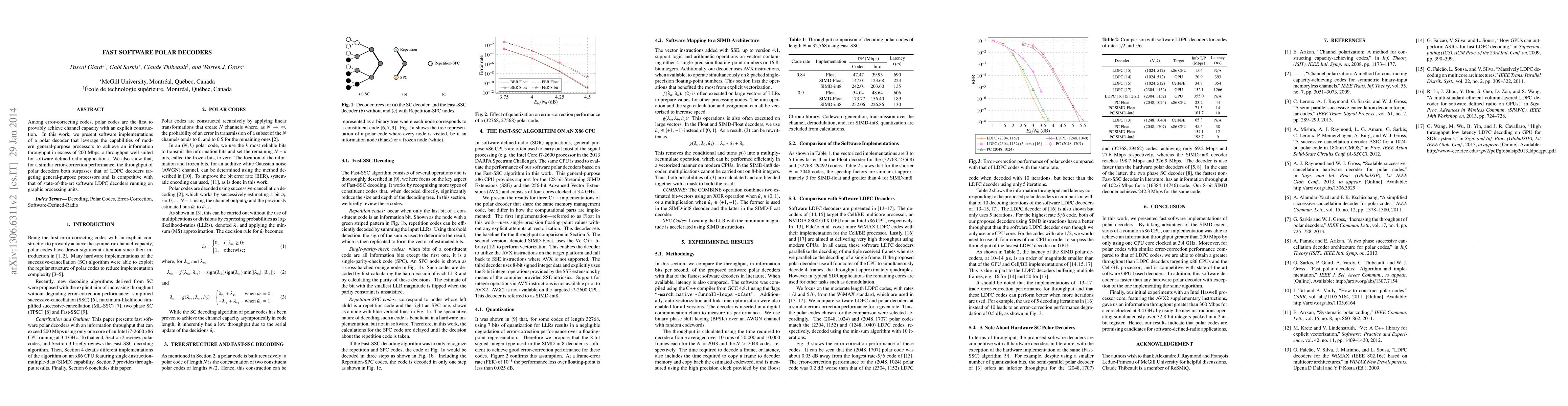 Among error-correcting codes, polar codes are the first to provably achieve channel capacity with an explicit construction. In this work, we present software implementations of a polar decoder that leverage the capabilities of modern general-purpose processors to achieve an information throughput in excess of 200 Mbps, a throughput well suited for software-defined-radio applications. We also show that, for a similar error-correction performance, the throughput of polar decoders both surpasses that of LDPC decoders targeting general-purpose processors and is competitive with that of state-of-the-art software LDPC decoders running on graphic processing units.
