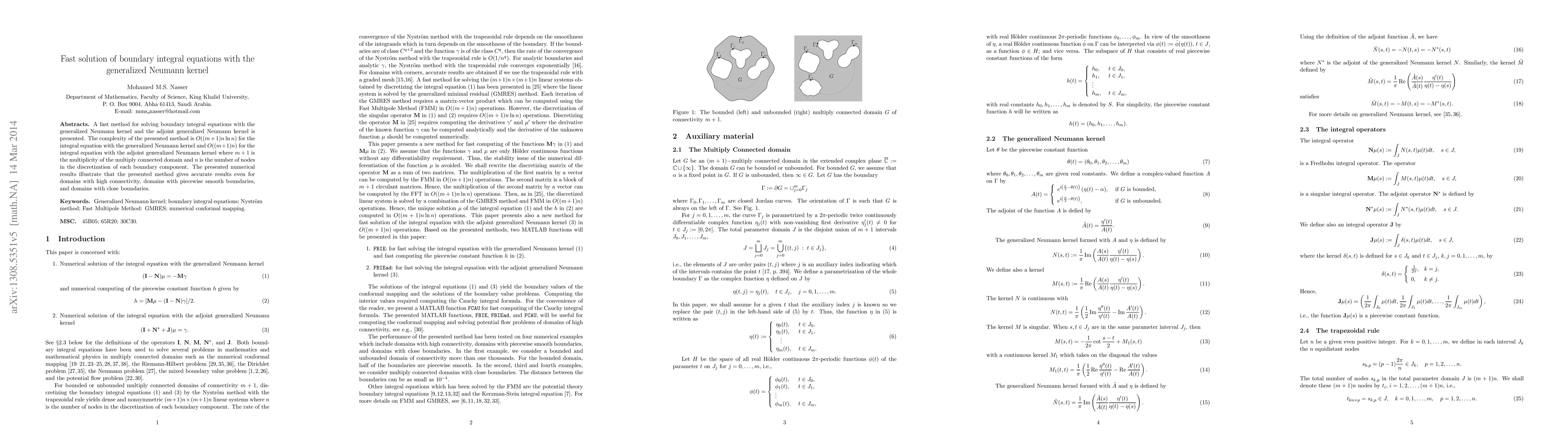 This paper presents a fast method for solving boundary integral equations using the generalized Neumann kernel, employing the Nyström method and GMRES with Fast Multipole Method (FMM) for matrix-vector products. The method achieves complexity of $O((m+1)n\ln n)$ and $O((m+1)n)$, demonstrating accuracy for complex, multiply connected domains.