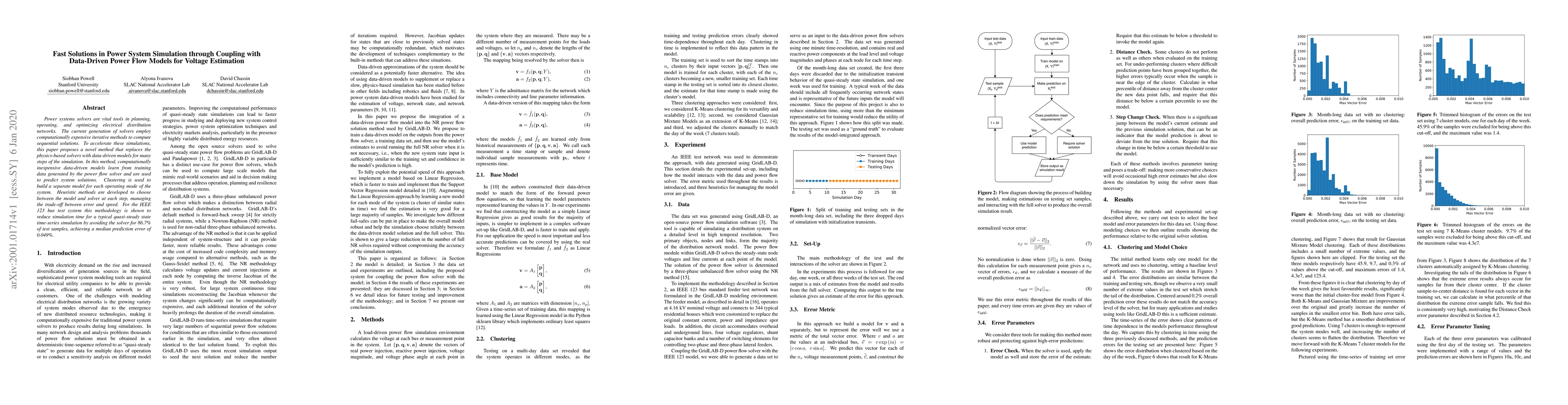 Power systems solvers are vital tools in planning, operating, and optimizing electrical distribution networks. The current generation of solvers employ computationally expensive iterative methods to compute sequential solutions. To accelerate these simulations, this paper proposes a novel method that replaces the physics-based solvers with data-driven models for many steps of the simulation. In this method, computationally inexpensive data-driven models learn from training data generated by the power flow solver and are used to predict system solutions. Clustering is used to build a separate model for each operating mode of the system. Heuristic methods are developed to choose between the model and solver at each step, managing the trade-off between error and speed. For the IEEE 123 bus test system this methodology is shown to reduce simulation time for a typical quasi-steady state time-series simulation by avoiding the solver for 86.7% of test samples, achieving a median prediction error of 0.049%.