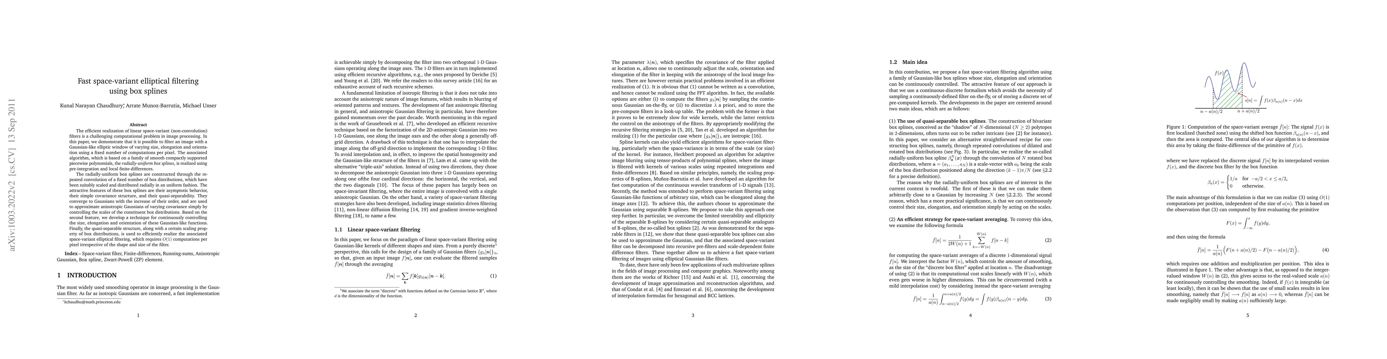 The efficient realization of linear space-variant (non-convolution) filters is a challenging computational problem in image processing. In this paper, we demonstrate that it is possible to filter an image with a Gaussian-like elliptic window of varying size, elongation and orientation using a fixed number of computations per pixel. The associated algorithm, which is based on a family of smooth compactly supported piecewise polynomials, the radially-uniform box splines, is realized using pre-integration and local finite-differences. The radially-uniform box splines are constructed through the repeated convolution of a fixed number of box distributions, which have been suitably scaled and distributed radially in an uniform fashion. The attractive features of these box splines are their asymptotic behavior, their simple covariance structure, and their quasi-separability. They converge to Gaussians with the increase of their order, and are used to approximate anisotropic Gaussians of varying covariance simply by controlling the scales of the constituent box distributions. Based on the second feature, we develop a technique for continuously controlling the size, elongation and orientation of these Gaussian-like functions. Finally, the quasi-separable structure, along with a certain scaling property of box distributions, is used to efficiently realize the associated space-variant elliptical filtering, which requires O(1) computations per pixel irrespective of the shape and size of the filter.