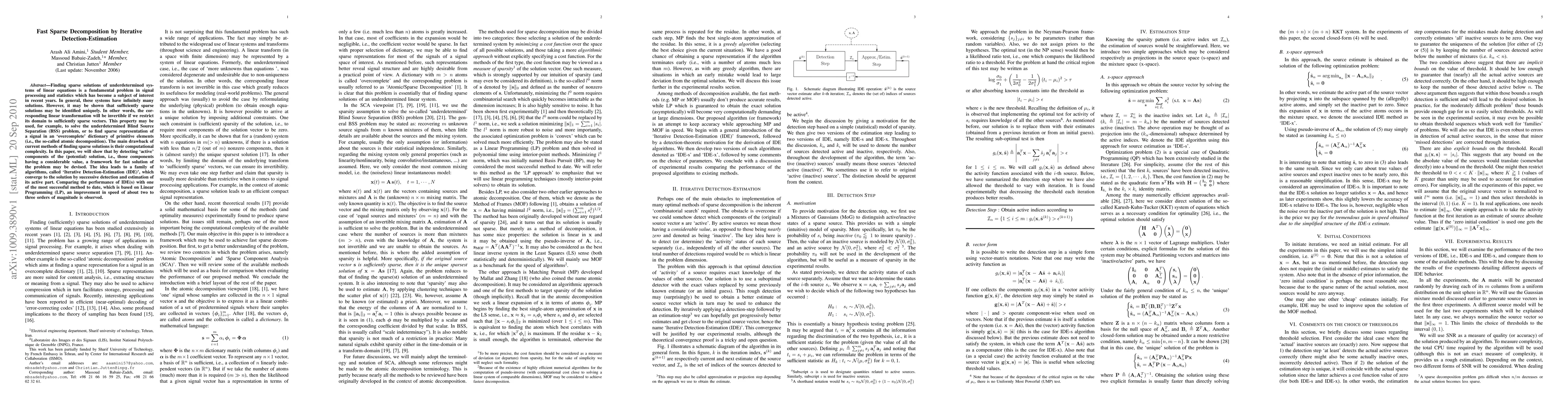 Finding sparse solutions of underdetermined systems of linear equations is a fundamental problem in signal processing and statistics which has become a subject of interest in recent years. In general, these systems have infinitely many solutions. However, it may be shown that sufficiently sparse solutions may be identified uniquely. In other words, the corresponding linear transformation will be invertible if we restrict its domain to sufficiently sparse vectors. This property may be used, for example, to solve the underdetermined Blind Source Separation (BSS) problem, or to find sparse representation of a signal in an `overcomplete' dictionary of primitive elements (i.e., the so-called atomic decomposition). The main drawback of current methods of finding sparse solutions is their computational complexity. In this paper, we will show that by detecting `active' components of the (potential) solution, i.e., those components having a considerable value, a framework for fast solution of the problem may be devised. The idea leads to a family of algorithms, called `Iterative Detection-Estimation (IDE)', which converge to the solution by successive detection and estimation of its active part. Comparing the performance of IDE(s) with one of the most successful method to date, which is based on Linear Programming (LP), an improvement in speed of about two to three orders of magnitude is observed.