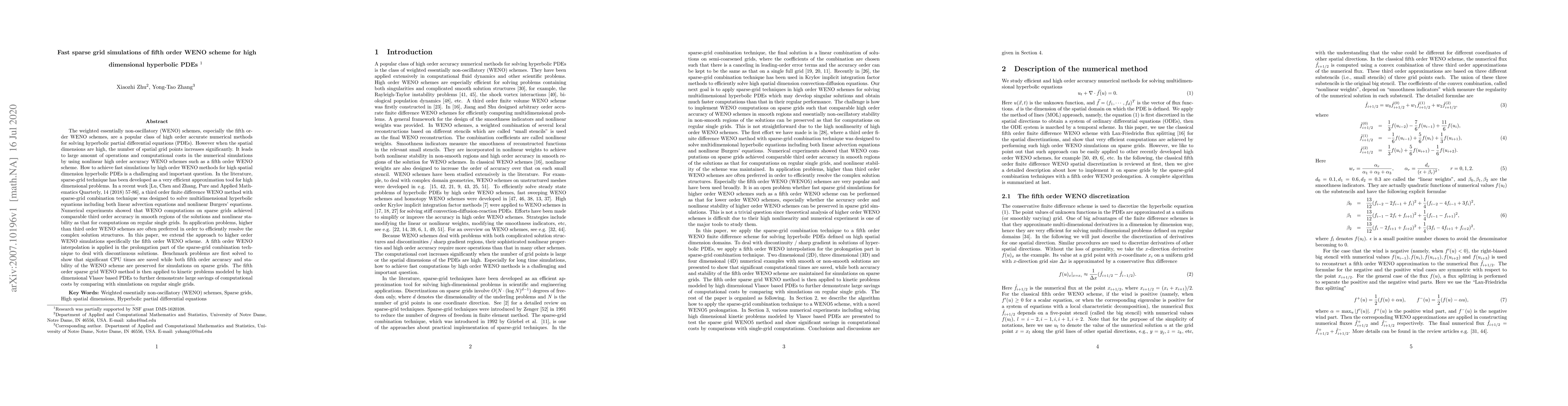 This paper proposes a fifth-order WENO scheme combined with sparse grid simulations to efficiently solve high-dimensional hyperbolic PDEs, achieving significant computational savings while maintaining high accuracy and stability. The method is demonstrated through benchmark problems and kinetic simulations based on Vlasov PDEs.