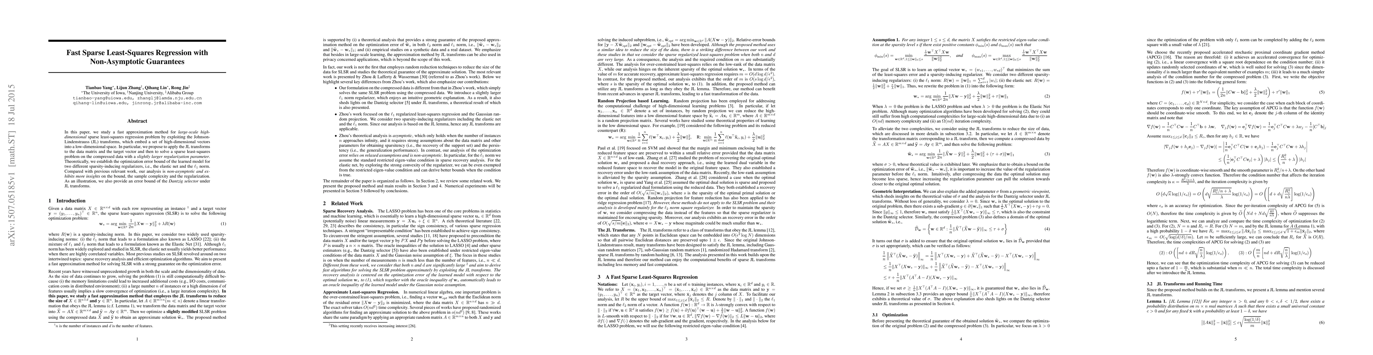 In this paper, we study a fast approximation method for {\it large-scale high-dimensional} sparse least-squares regression problem by exploiting the Johnson-Lindenstrauss (JL) transforms, which embed a set of high-dimensional vectors into a low-dimensional space. In particular, we propose to apply the JL transforms to the data matrix and the target vector and then to solve a sparse least-squares problem on the compressed data with a {\it slightly larger regularization parameter}. Theoretically, we establish the optimization error bound of the learned model for two different sparsity-inducing regularizers, i.e., the elastic net and the $\ell_1$ norm. Compared with previous relevant work, our analysis is {\it non-asymptotic and exhibits more insights} on the bound, the sample complexity and the regularization. As an illustration, we also provide an error bound of the {\it Dantzig selector} under JL transforms.