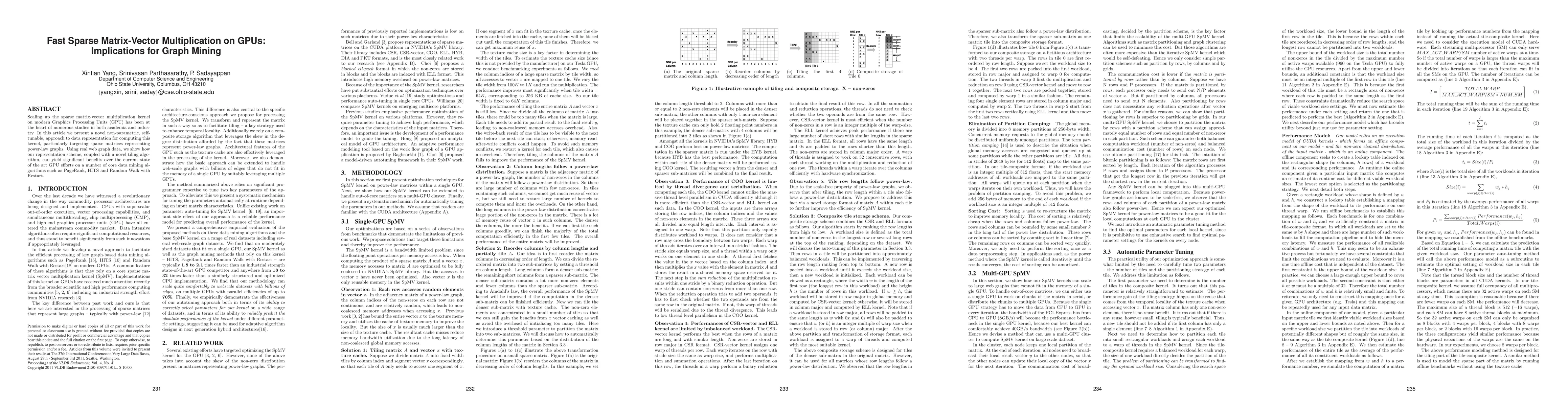 This paper introduces a novel self-tunable data representation and tiling algorithm for fast sparse matrix-vector multiplication on GPUs, demonstrating significant improvements over current methods for graph mining algorithms like PageRank, HITS, and Random Walk with Restart.
