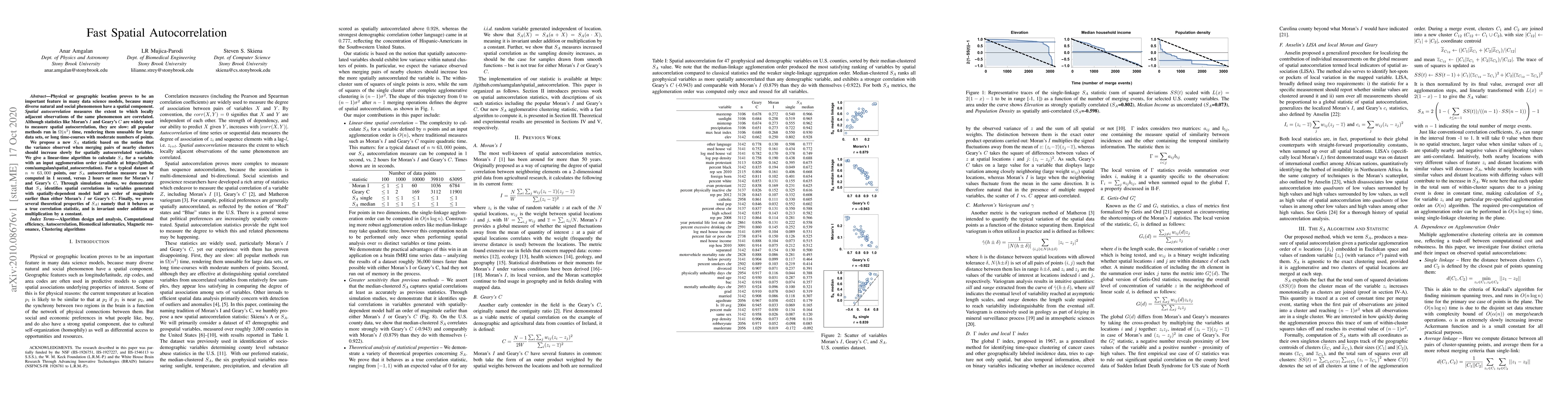 Physical or geographic location proves to be an important feature in many data science models, because many diverse natural and social phenomenon have a spatial component. Spatial autocorrelation measures the extent to which locally adjacent observations of the same phenomenon are correlated. Although statistics like Moran's $I$ and Geary's $C$ are widely used to measure spatial autocorrelation, they are slow: all popular methods run in $\Omega(n^2)$ time, rendering them unusable for large data sets, or long time-courses with moderate numbers of points. We propose a new $S_A$ statistic based on the notion that the variance observed when merging pairs of nearby clusters should increase slowly for spatially autocorrelated variables. We give a linear-time algorithm to calculate $S_A$ for a variable with an input agglomeration order (available at https://github.com/aamgalan/spatial_autocorrelation). For a typical dataset of $n \approx 63,000$ points, our $S_A$ autocorrelation measure can be computed in 1 second, versus 2 hours or more for Moran's $I$ and Geary's $C$. Through simulation studies, we demonstrate that $S_A$ identifies spatial correlations in variables generated with spatially-dependent model half an order of magnitude earlier than either Moran's $I$ or Geary's $C$. Finally, we prove several theoretical properties of $S_A$: namely that it behaves as a true correlation statistic, and is invariant under addition or multiplication by a constant.