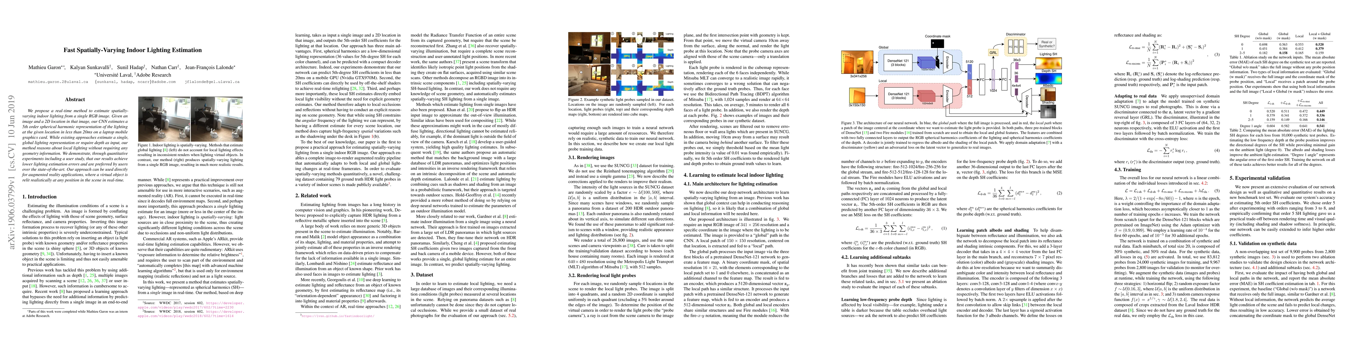 This research paper proposes a real-time CNN-based method for estimating spatially-varying indoor lighting from a single RGB image, providing a 5th order spherical harmonic representation without requiring depth information. The method achieves lower estimation errors and is preferred by users compared to existing global lighting estimation techniques, making it suitable for augmented reality applications.