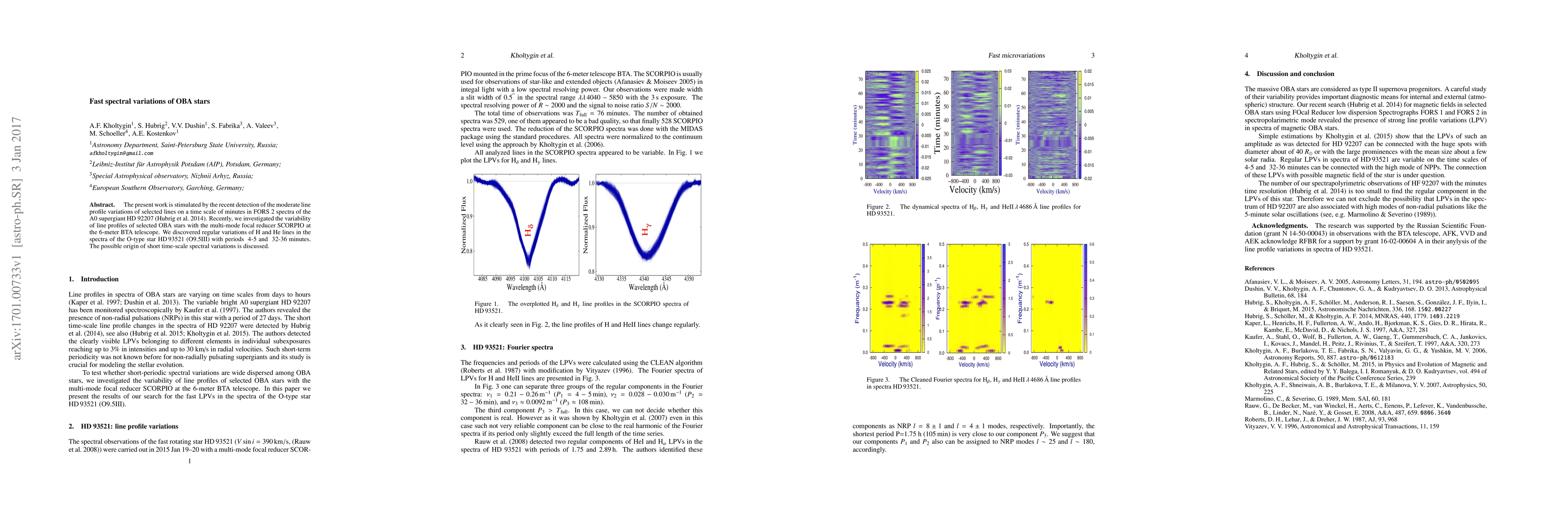 Our search for magnetic fields in selected OBA stars using FOcal Reducer low dispersion Spectrographs FORS 1 and FORS 2 in spectropolarimetric mode revealed the presence of strong line profile variations (LPV) in spectra of magnetic OBA stars. More specifically, we detected moderate line profile variations of selected lines on a time scale of minutes in FORS 2 spectra of the A0 supergiant HD 92207 (Hubrig et al. 2014). Recently, we investigated the variability of line profiles of selected OBA stars with the multi-mode focal reducer SCORPIO at the 6-meter BTA telescope. We discovered regular variations of H and He lines in the spectra of the O-type star HD 93521 (O9.5III) with periods ~4-5 and ~32-36 minutes. The possible origin of short time-scale spectral variations is discussed.