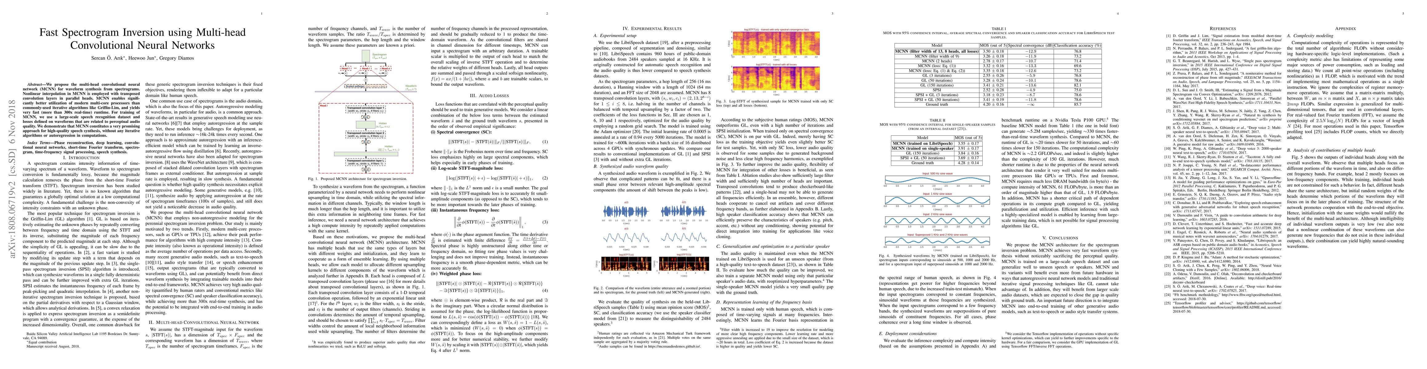This paper proposes a multi-head convolutional neural network (MCNN) for fast spectrogram inversion, achieving over 300x real-time waveform synthesis. The MCNN uses parallel transposed convolution layers for nonlinear interpolation, significantly outperforming iterative algorithms like Griffin-Lim in compute efficiency.