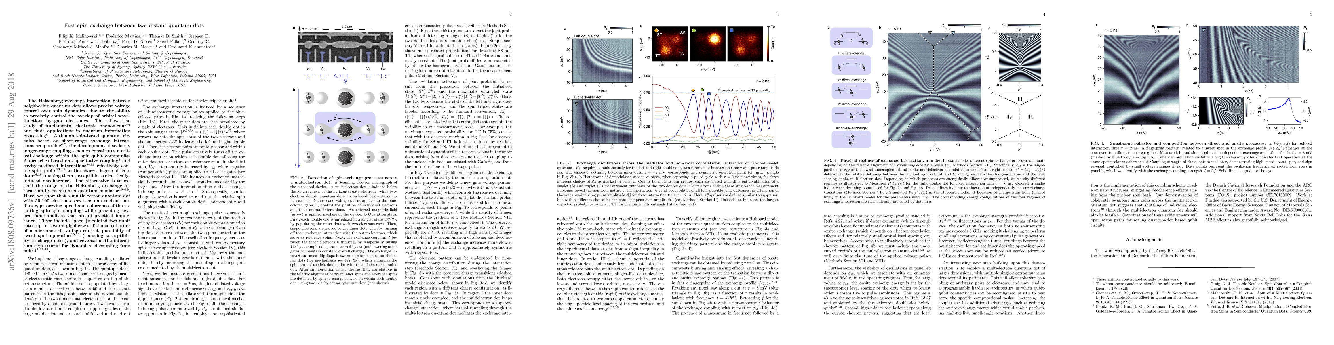 This paper explores fast spin exchange between distant quantum dots using a multielectron quantum dot as a mediator, achieving scalable, long-range coupling with gigahertz rates, micrometer distances, and voltage control, while maintaining coherence and reducing susceptibility to charge noise.
