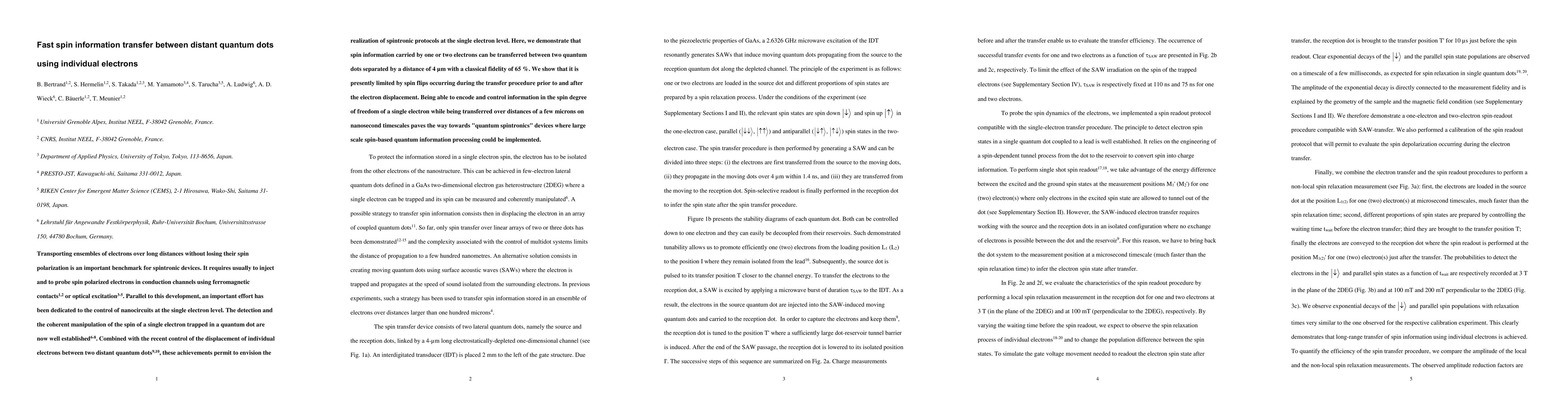 This paper demonstrates the transfer of spin information between distant quantum dots using individual electrons, achieving a classical fidelity of 65%. The study highlights the potential for "quantum spintronics" devices by showing the ability to encode and manipulate spin information over micrometer distances on nanosecond timescales.