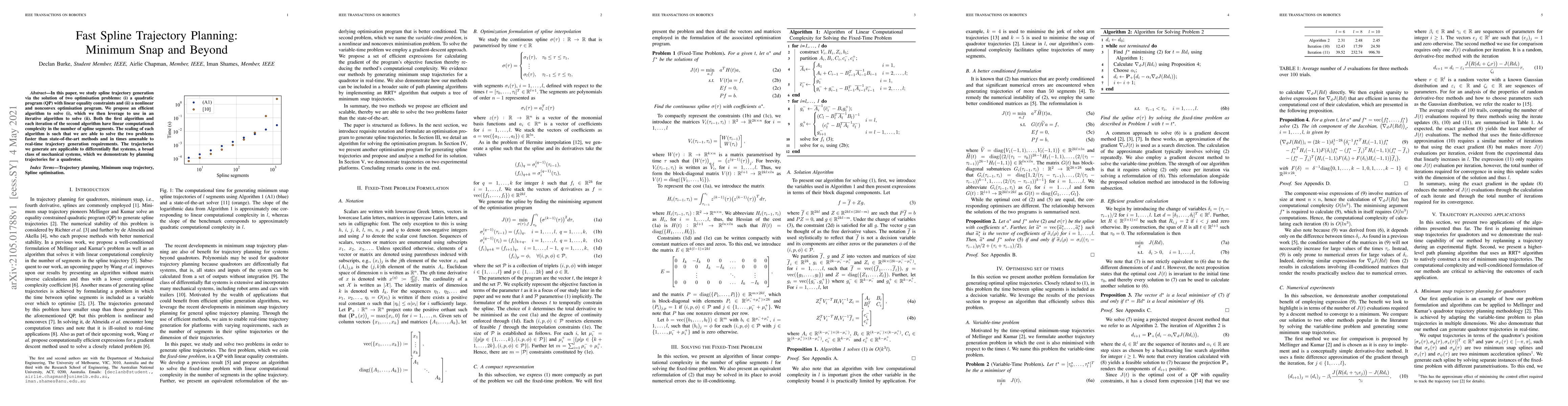 In this paper, we study spline trajectory generation via the solution of two optimisation problems: (i) a quadratic program (QP) with linear equality constraints and (ii) a nonlinear and nonconvex optimisation program. We propose an efficient algorithm to solve (i), which we then leverage to use in an iterative algorithm to solve (ii). Both the first algorithm and each iteration of the second algorithm have linear computational complexity in the number of spline segments. The scaling of each algorithm is such that we are able to solve the two problems faster than state-of-the-art methods and in times amenable to real-time trajectory generation requirements. The trajectories we generate are applicable to differentially flat systems, a broad class of mechanical systems, which we demonstrate by planning trajectories for a quadrotor.
