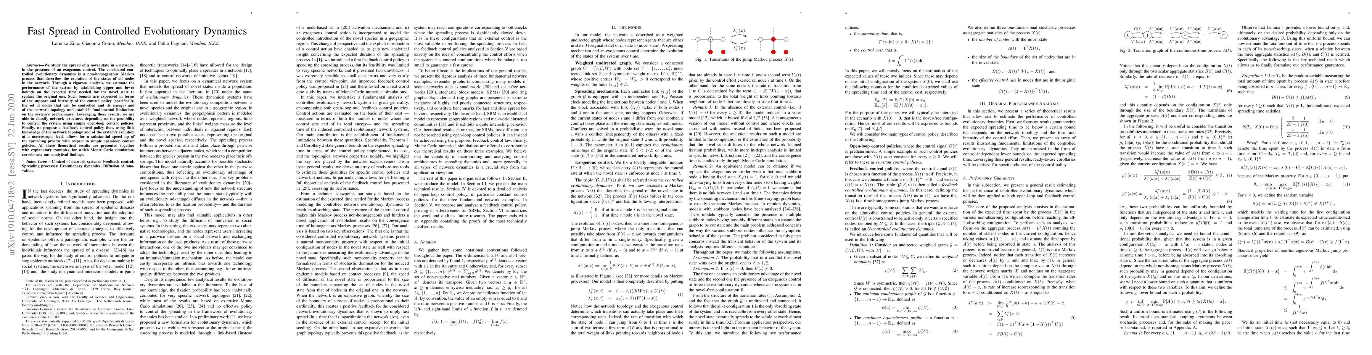We study the spread of a novel state in a network, in the presence of an exogenous control. The considered controlled evolutionary dynamics is a non-homogeneous Markov process that describes the evolution of the states of all nodes in the network. Through a rigorous analysis, we estimate the performance of the system by establishing upper and lower bounds on the expected time needed for the novel state to replace the original one. Such bounds are expressed in terms of the support and intensity of the control policy (specifically, the set of nodes that can be controlled and its energy) and of the network topology and establish fundamental limitations on the system's performance. Leveraging these results, we are able to classify network structures depending on the possibility to control the system using simple open-loop control policies. Finally, we propose a feedback control policy that, using little knowledge of the network topology and of the system's evolution at a macroscopic level, allows for a substantial speed up of the spreading process with respect to simple open-loop control policies. All these theoretical results are presented together with explanatory examples, for which Monte Carlo simulations corroborate our analytical findings.