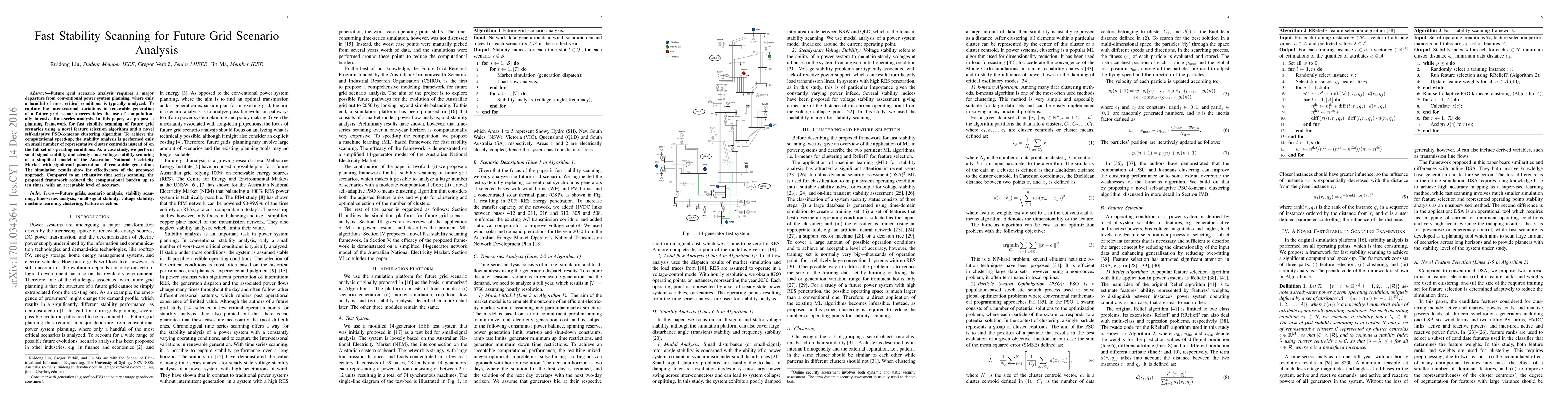 This paper proposes a fast stability scanning framework for future grid scenarios using a feature selection algorithm and a self-adaptive PSO-k-means clustering method. The approach reduces computational load by analyzing only representative cluster centroids, achieving up to ten times faster results with acceptable accuracy compared to exhaustive time-series analysis.