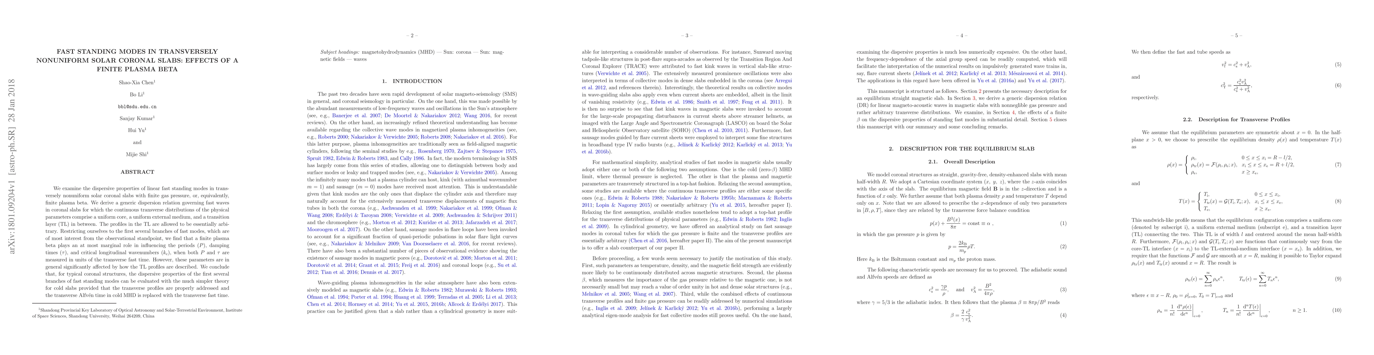 This paper investigates the dispersive properties of linear fast standing modes in nonuniform solar coronal slabs with finite plasma beta, deriving a dispersion relation for various transverse profiles. It finds that while finite plasma beta has a minimal effect on the periods, damping times, and critical wavenumbers of these modes, the profiles in the transition layer significantly influence these parameters.