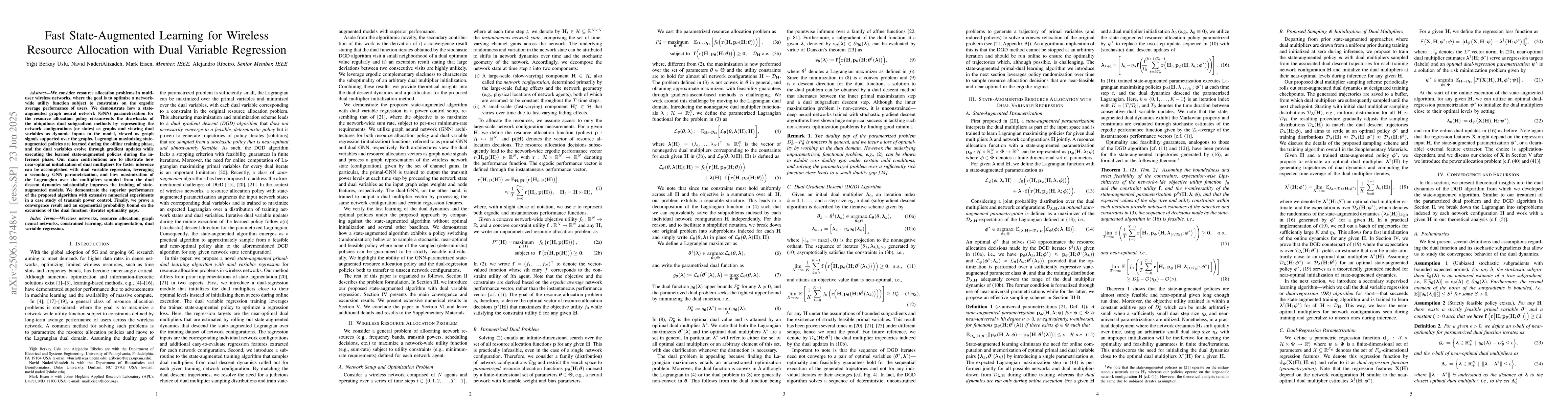 We consider resource allocation problems in multi-user wireless networks, where the goal is to optimize a network-wide utility function subject to constraints on the ergodic average performance of users. We demonstrate how a state-augmented graph neural network (GNN) parametrization for the resource allocation policy circumvents the drawbacks of the ubiquitous dual subgradient methods by representing the network configurations (or states) as graphs and viewing dual variables as dynamic inputs to the model, viewed as graph signals supported over the graphs. Lagrangian maximizing state-augmented policies are learned during the offline training phase, and the dual variables evolve through gradient updates while executing the learned state-augmented policies during the inference phase. Our main contributions are to illustrate how near-optimal initialization of dual multipliers for faster inference can be accomplished with dual variable regression, leveraging a secondary GNN parametrization, and how maximization of the Lagrangian over the multipliers sampled from the dual descent dynamics substantially improves the training of state-augmented models. We demonstrate the superior performance of the proposed algorithm with extensive numerical experiments in a case study of transmit power control. Finally, we prove a convergence result and an exponential probability bound on the excursions of the dual function (iterate) optimality gaps.