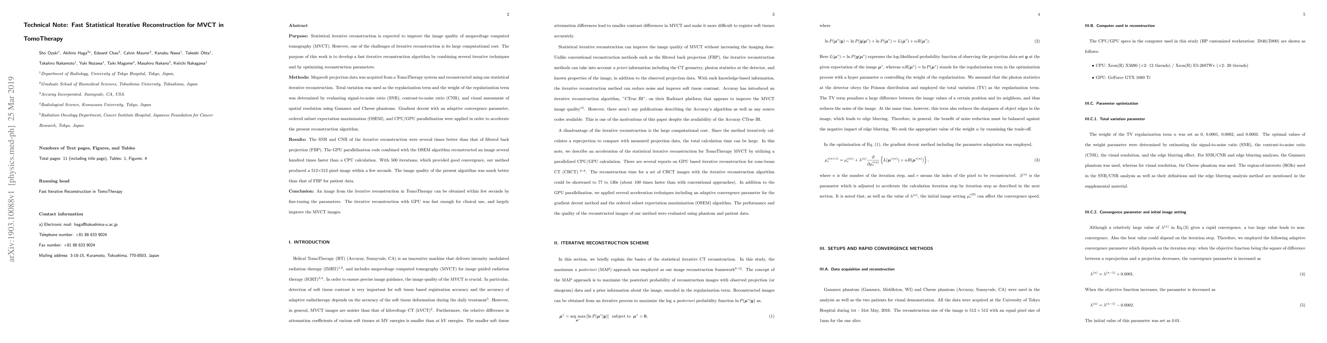 This paper develops a fast statistical iterative reconstruction algorithm for megavoltage computed tomography (MVCT) in TomoTherapy, combining gradient descent, OSEM, and GPU parallelization to significantly reduce computational costs. The method achieved superior image quality compared to filtered back projection, with reconstruction times reduced to seconds, making it suitable for clinical use.