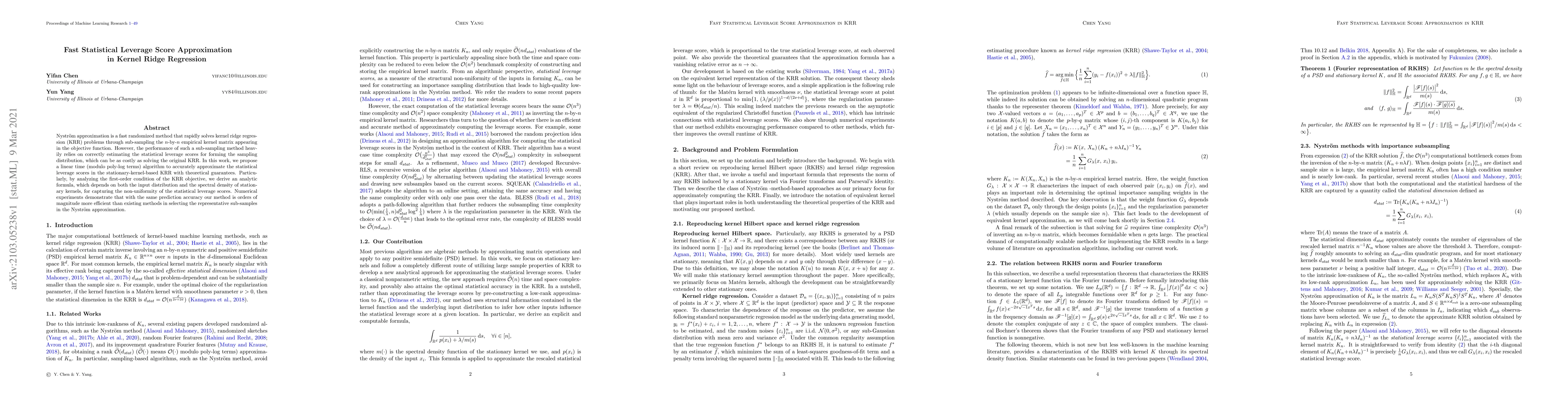 This paper proposes a linear time algorithm for accurately approximating statistical leverage scores in kernel ridge regression, significantly improving the efficiency of Nyström approximation without sacrificing prediction accuracy. The method derives an analytic formula based on input distribution and kernel spectral density, outperforming existing sub-sampling techniques by orders of magnitude in computational efficiency.