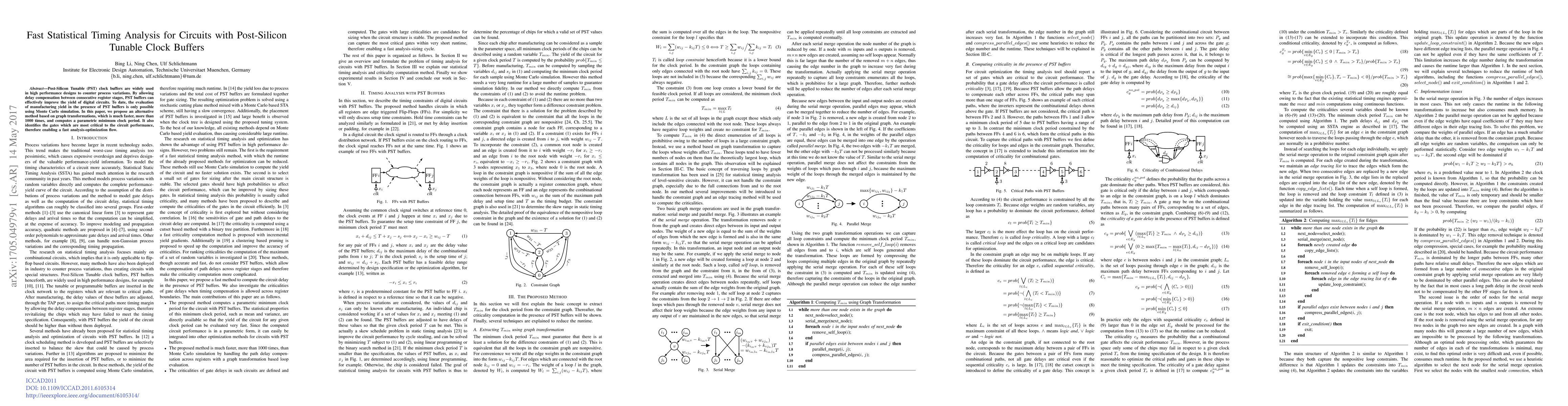 This paper proposes a fast statistical timing analysis method for circuits using Post-Silicon Tunable clock buffers, offering a 1000x speedup over Monte Carlo simulations and identifying critical circuit gates for optimization.