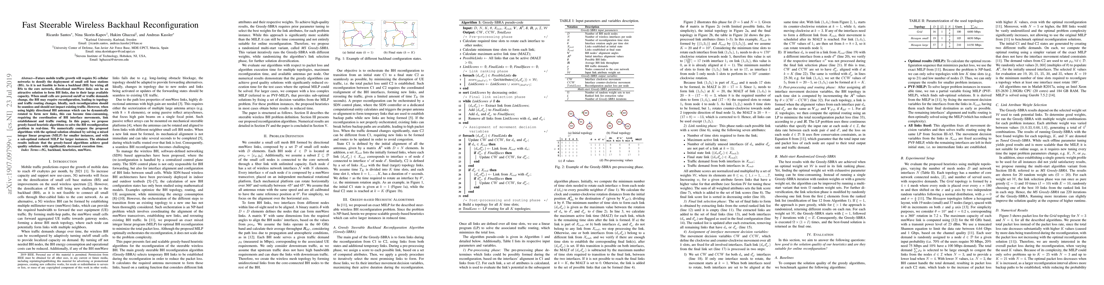 This paper proposes greedy-based heuristic algorithms for fast reconfiguration of directional mmWave backhaul links in 5G networks, addressing the challenge of seamless network changes without impacting existing traffic. The algorithms achieve high-quality solutions with significantly reduced execution time compared to optimal and sub-optimal methods.