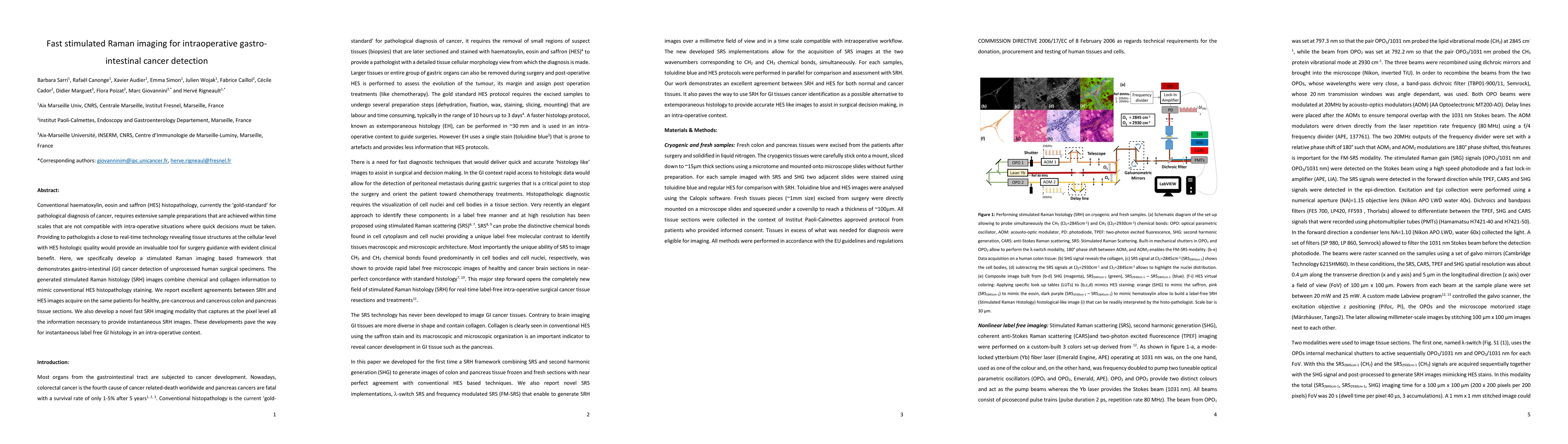 This paper develops a fast stimulated Raman imaging framework for real-time intraoperative detection of gastro-intestinal cancer, providing near-instantaneous histology comparable to conventional HES staining without extensive sample preparation. The novel fast SRH imaging modality enables immediate label-free histology, potentially revolutionizing surgical guidance.