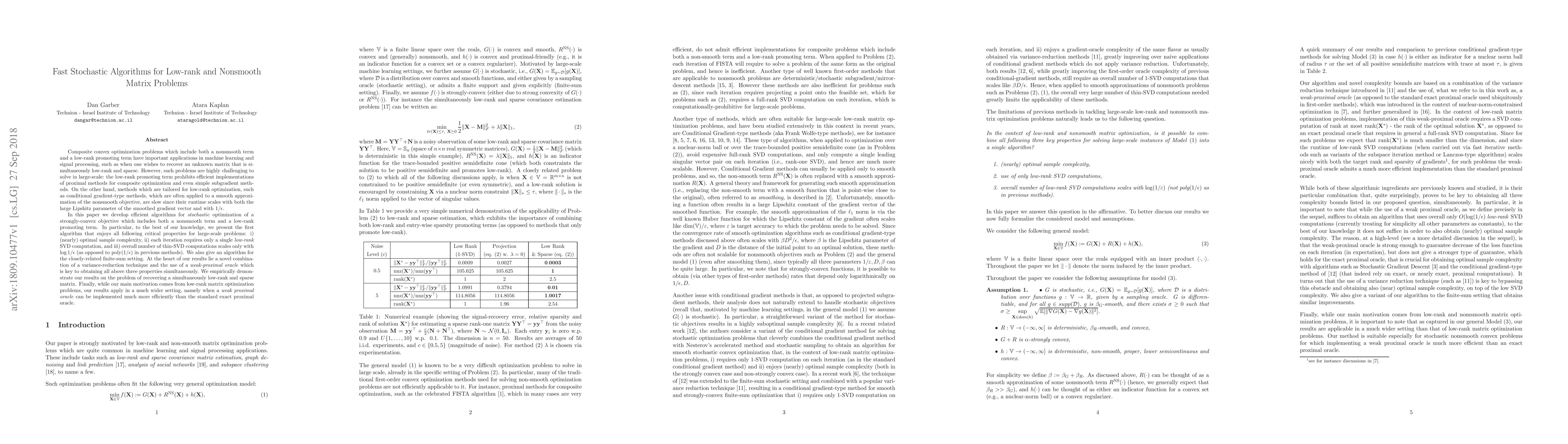 Composite convex optimization problems which include both a nonsmooth term and a low-rank promoting term have important applications in machine learning and signal processing, such as when one wishes to recover an unknown matrix that is simultaneously low-rank and sparse. However, such problems are highly challenging to solve in large-scale: the low-rank promoting term prohibits efficient implementations of proximal methods for composite optimization and even simple subgradient methods. On the other hand, methods which are tailored for low-rank optimization, such as conditional gradient-type methods, which are often applied to a smooth approximation of the nonsmooth objective, are slow since their runtime scales with both the large Lipshitz parameter of the smoothed gradient vector and with $1/\epsilon$. In this paper we develop efficient algorithms for \textit{stochastic} optimization of a strongly-convex objective which includes both a nonsmooth term and a low-rank promoting term. In particular, to the best of our knowledge, we present the first algorithm that enjoys all following critical properties for large-scale problems: i) (nearly) optimal sample complexity, ii) each iteration requires only a single \textit{low-rank} SVD computation, and iii) overall number of thin-SVD computations scales only with $\log{1/\epsilon}$ (as opposed to $\textrm{poly}(1/\epsilon)$ in previous methods). We also give an algorithm for the closely-related finite-sum setting. At the heart of our results lie a novel combination of a variance-reduction technique and the use of a \textit{weak-proximal oracle} which is key to obtaining all above three properties simultaneously.