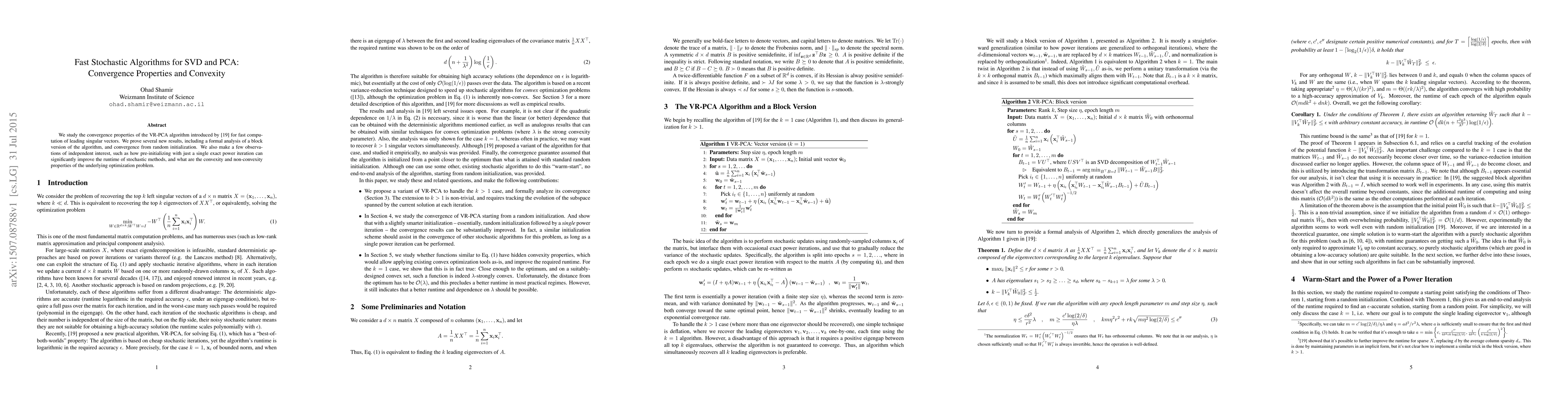This paper investigates the convergence properties of the VR-PCA algorithm for computing leading singular vectors, proving new results including block algorithm analysis and convergence from random initialization. It also highlights the benefits of pre-initializing with a single exact power iteration and examines the convexity and non-convexity of the optimization problem.