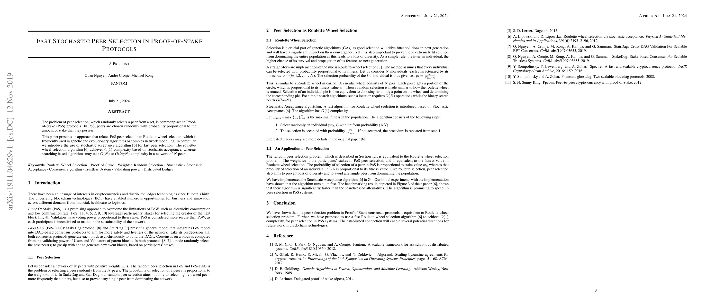 The problem of peer selection, which randomly selects a peer from a set, is commonplace in Proof-of-Stake (PoS) protocols. In PoS, peers are chosen randomly with probability proportional to the amount of stake that they possess. This paper presents an approach that relates PoS peer selection to Roulette-wheel selection, which is frequently used in genetic and evolutionary algorithms or complex network modelling. In particular, we introduce the use of stochastic acceptance algorithm [6] for fast peer selection. The roulette-wheel selection algorithm [6] achieves O(1) complexity based on stochastic acceptance, whereas searching based algorithms may take O(N ) or O(logN ) complexity in a network of N peers.