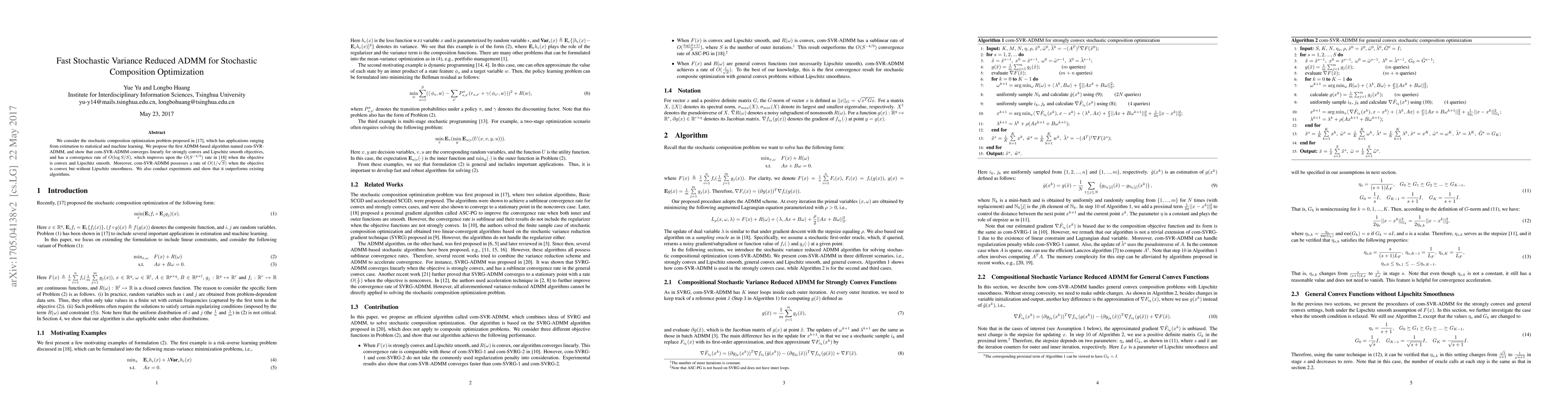 This paper proposes com-SVR-ADMM, an ADMM-based algorithm for stochastic composition optimization, demonstrating linear convergence for strongly convex and Lipschitz smooth objectives, and improved convergence rates compared to existing methods. Experimental results show superior performance over current algorithms.