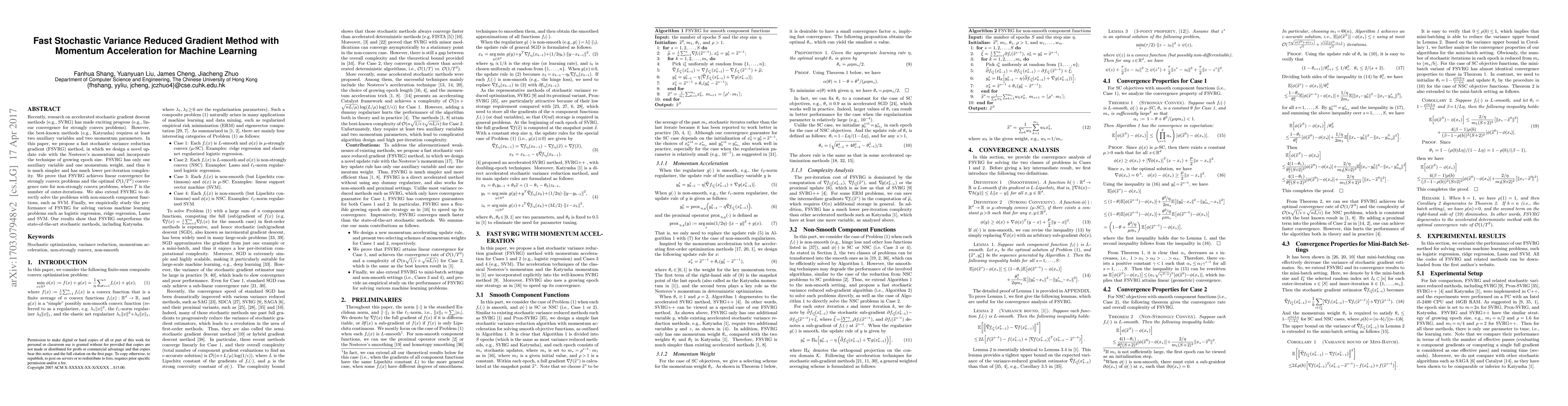 This paper introduces FSVRG, a simplified stochastic variance reduction gradient method with Nesterov's momentum for machine learning optimization. FSVRG requires fewer variables and parameters than existing methods like Katyusha, yet achieves linear convergence for strongly convex problems and the optimal O(1/T^2) rate for non-strongly convex problems. Empirical results demonstrate FSVRG outperforming state-of-the-art stochastic methods in solving various machine learning tasks, including logistic regression, ridge regression, Lasso, and SVM.