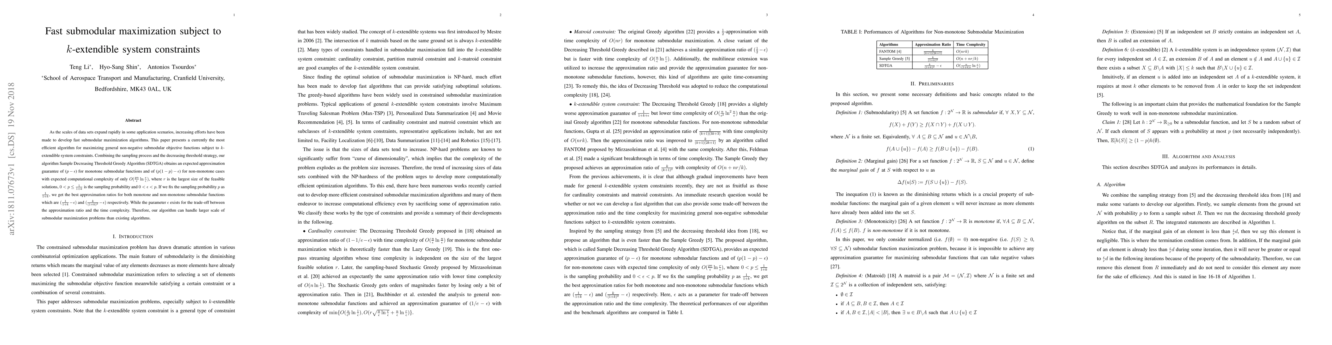 This paper introduces the Sample Decreasing Threshold Greedy Algorithm (SDTGA), the most efficient method for maximizing general non-negative submodular functions under $k$-extendible system constraints. SDTGA combines sampling and threshold strategies to achieve an approximation guarantee of ($p-\epsilon$) for monotone functions and ($p(1-p)-\epsilon$) for non-monotone cases, with computational complexity $O(\frac{pn}{\epsilon}\ln\frac{r}{\epsilon})$.