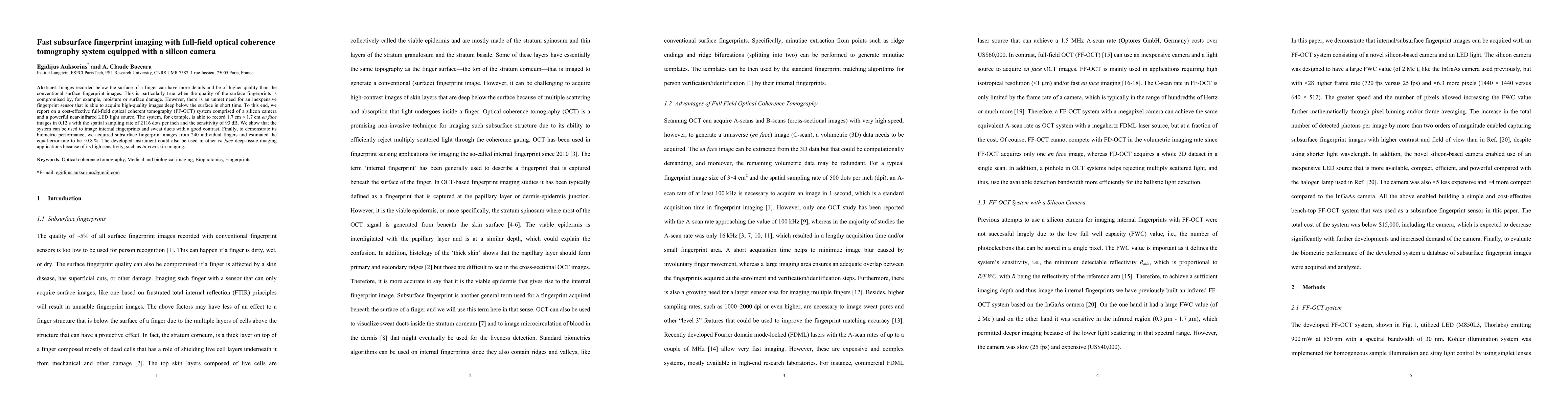 The research presents a cost-effective full-field optical coherence tomography (FF-OCT) system using a silicon camera and near-infrared LED light source. This system captures high-resolution, deep-tissue images of fingerprints and sweat ducts in seconds, demonstrating a ~0.8% equal-error-rate for biometric performance. The technology has potential applications beyond fingerprinting, such as in vivo skin imaging.