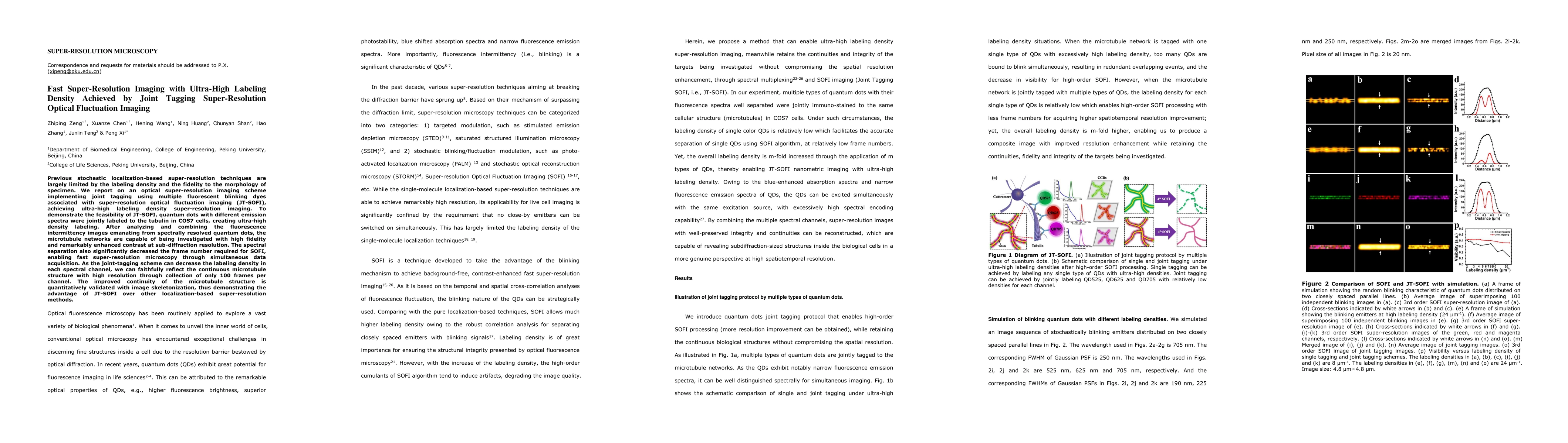 This paper introduces a novel super-resolution imaging technique called Joint Tagging Super-Resolution Optical Fluctuation Imaging (JT-SOFI) that achieves ultra-high labeling density and high fidelity to specimen morphology. By using multiple fluorescent dyes and spectral separation, JT-SOFI significantly reduces the frame number needed and enhances contrast, enabling fast super-resolution microscopy with high resolution and continuity.