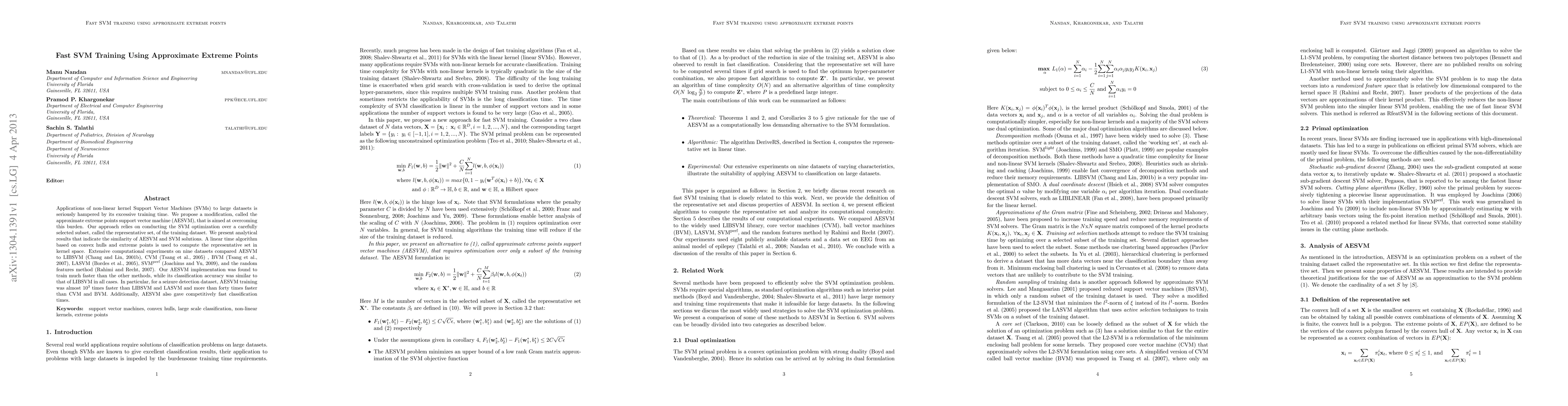 This paper proposes the Approximate Extreme Points Support Vector Machine (AESVM) to speed up SVM training for large datasets. AESVM selects a representative subset of training data, significantly reducing training time while maintaining classification accuracy comparable to LIBSVM. Experiments show AESVM trains much faster than other methods, with up to 1,000 times faster training on some datasets.