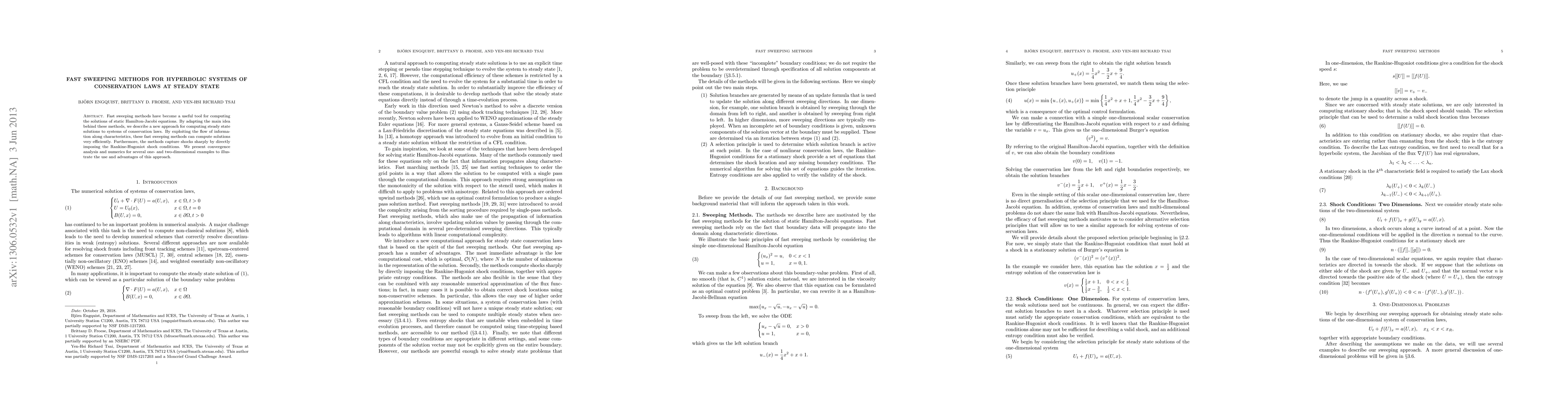 This paper introduces fast sweeping methods for efficiently solving steady-state hyperbolic systems of conservation laws, leveraging information flow along characteristics and directly imposing Rankine-Hugoniot shock conditions. The approach is demonstrated through convergence analysis and numerical examples in various dimensions.