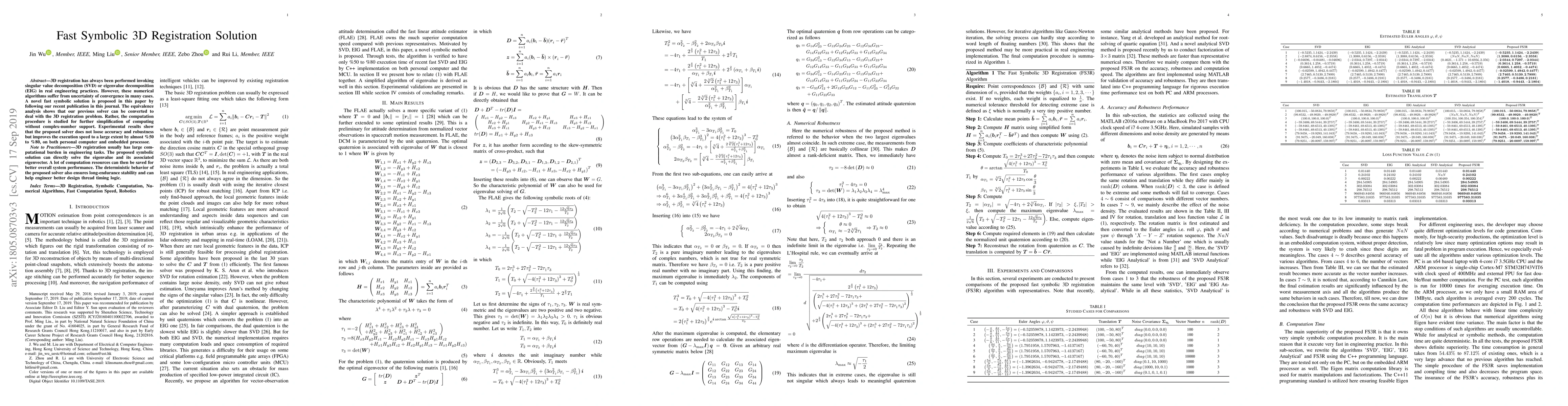 3D registration has always been performed invoking singular value decomposition (SVD) or eigenvalue decomposition (EIG) in real engineering practices. However, these numerical algorithms suffer from uncertainty of convergence in many cases. A novel fast symbolic solution is proposed in this paper by following our recent publication in this journal. The equivalence analysis shows that our previous solver can be converted to deal with the 3D registration problem. Rather, the computation procedure is studied for further simplification of computing without complex-number support. Experimental results show that the proposed solver does not loose accuracy and robustness but improves the execution speed to a large extent by almost %50 to %80, on both personal computer and embedded processor.