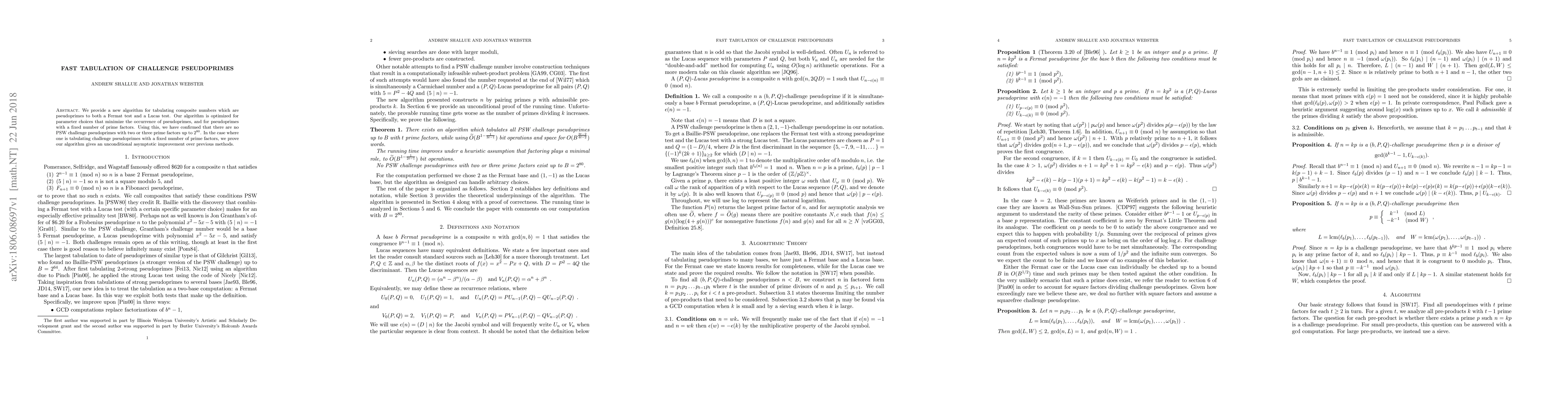 The paper presents an optimized algorithm for listing pseudoprimes passing both Fermat and Lucas tests, confirming the absence of PSW challenge pseudoprimes with two or three prime factors below $2^{80}$, and proving an asymptotic improvement over prior methods for fixed prime factor counts.