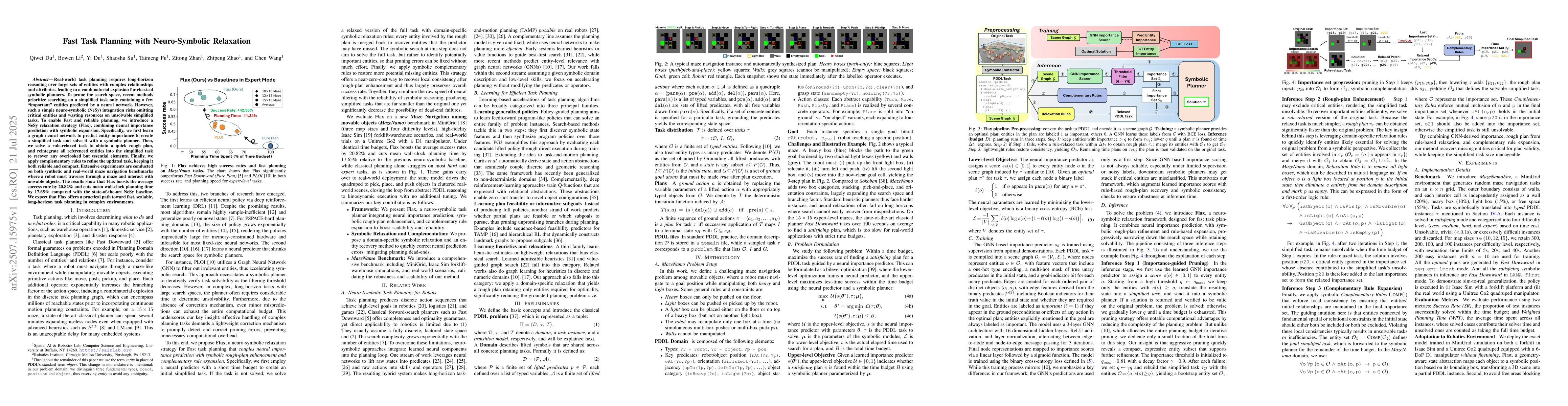 Real-world task planning requires long-horizon reasoning over large sets of entities with complex relationships and attributes, leading to a combinatorial explosion for classical symbolic planners. To prune the search space, recent methods prioritize searching on a simplified task only containing a few "important" entities predicted by a neural network. However, such a simple neuro-symbolic (NeSy) integration risks omitting critical entities and wasting resources on unsolvable simplified tasks. To enable Fast and reliable planning, we introduce a NeSy relaxation strategy (Flax), combining neural importance prediction with symbolic expansion. Specifically, we first learn a graph neural network to predict entity importance to create a simplified task and solve it with a symbolic planner. Then, we solve a rule-relaxed task to obtain a quick rough plan, and reintegrate all referenced entities into the simplified task to recover any overlooked but essential elements. Finally, we apply complementary rules to refine the updated task, keeping it both reliable and compact. Extensive experiments are conducted on both synthetic and real-world maze navigation benchmarks where a robot must traverse through a maze and interact with movable objects. The results show that Flax boosts the average success rate by 20.82% and cuts mean wall-clock planning time by 17.65% compared with the state-of-the-art NeSy baseline. We expect that Flax offers a practical path toward fast, scalable, long-horizon task planning in complex environments.
