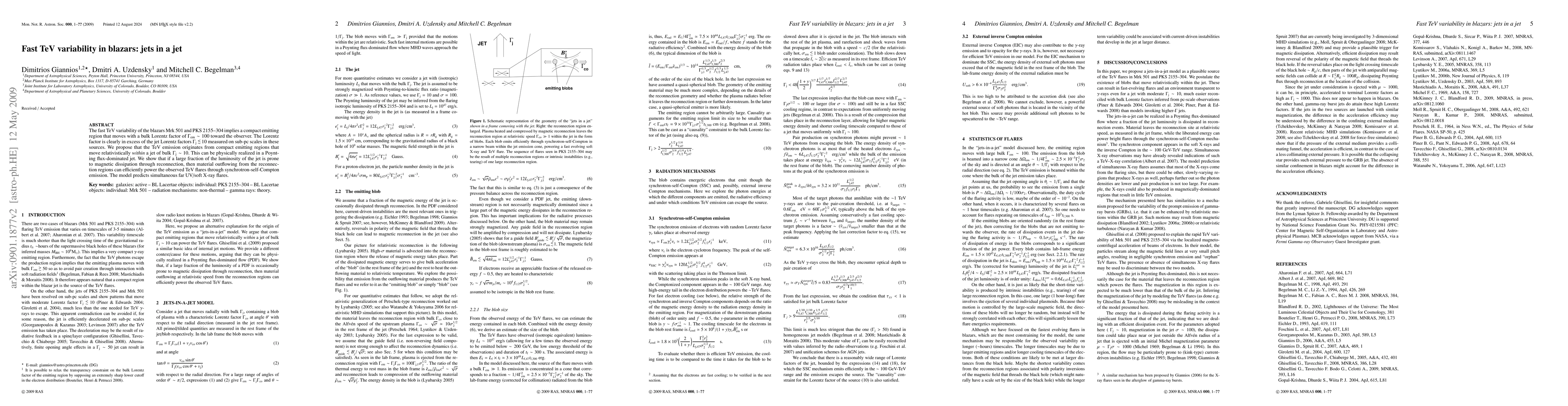 The fast TeV variability in blazars Mrk 501 and PKS 2155-304 suggests compact emitting regions moving relativistically within jets with a bulk Lorentz factor exceeding jet Lorentz factors. The TeV emission is likely powered by reconnection regions in a Poynting flux-dominated jet, predicting simultaneous far UV/soft X-ray flares.