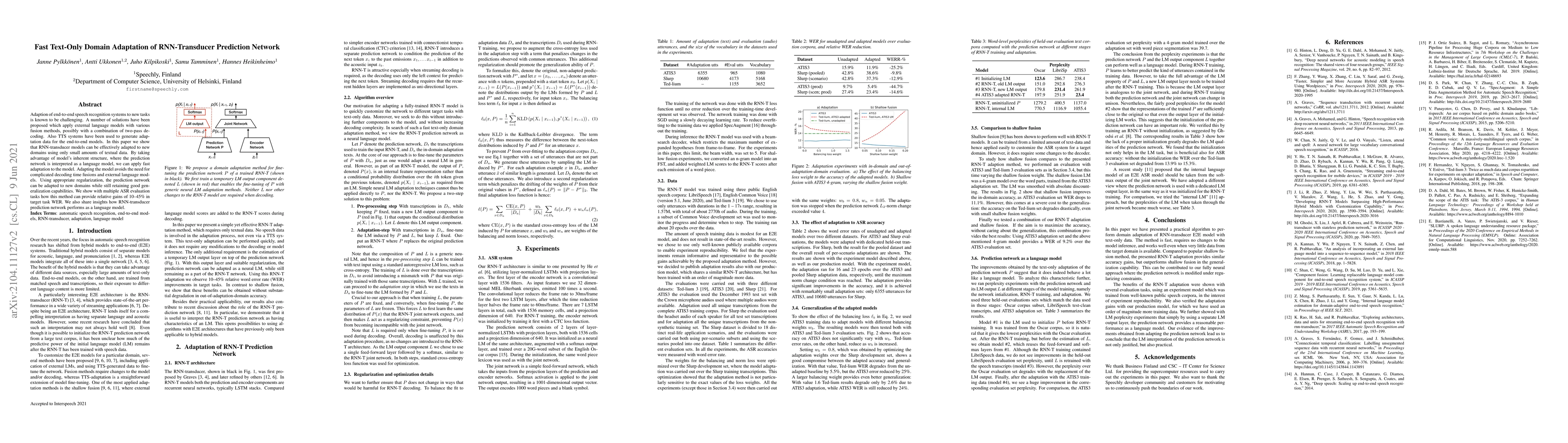 This paper demonstrates that RNN-transducer models can be rapidly adapted to new text domains using minimal textual data, leveraging the prediction network's inherent language modeling capabilities. The method achieves significant improvements in target task Word Error Rates (10-45%) without requiring complex decoding fusions or external language models.