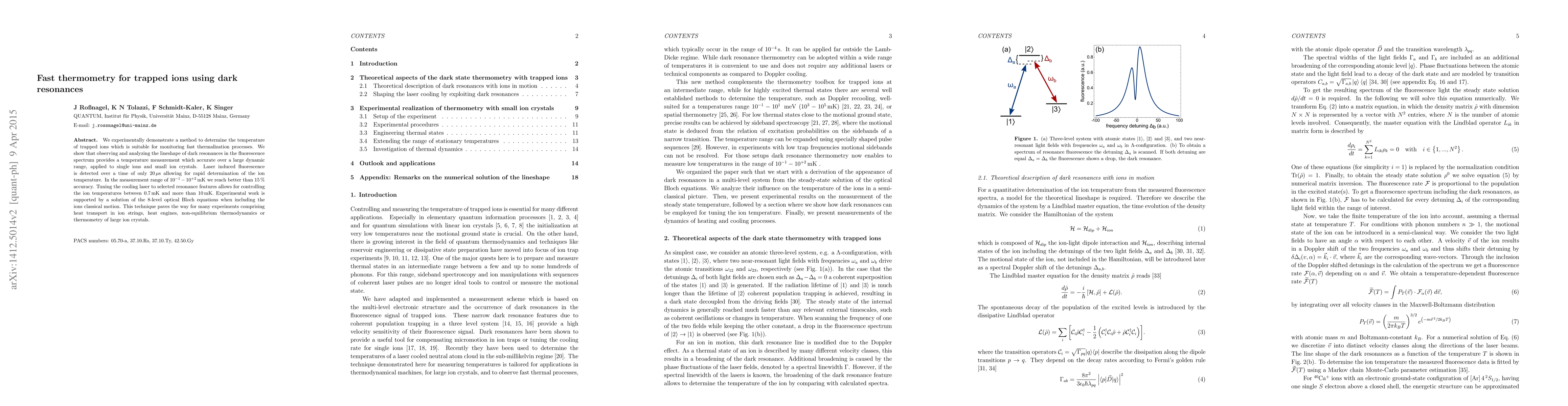 We experimentally demonstrate a method to determine the temperature of trapped ions which is suitable for monitoring fast thermalization processes. We show that observing and analyzing the lineshape of dark resonances in the fluorescence spectrum provides a temperature measurement which accurate over a large dynamic range, applied to single ions and small ion crystals. Laser induced fluorescence is detected over a time of only $20\,\mu$s allowing for rapid determination of the ion temperature. In the measurement range of $10^{-1}-10^{+2}\,$mK we reach better than $15\,\%$ accuracy. Tuning the cooling laser to selected resonance features allows for controlling the ion temperatures between $0.7\,$mK and more than $10\,$mK. Experimental work is supported by a solution of the 8-level optical Bloch equations when including the ions classical motion. This technique paves the way for many experiments comprising heat transport in ion strings, heat engines, non-equilibrium thermodynamics or thermometry of large ion crystals.