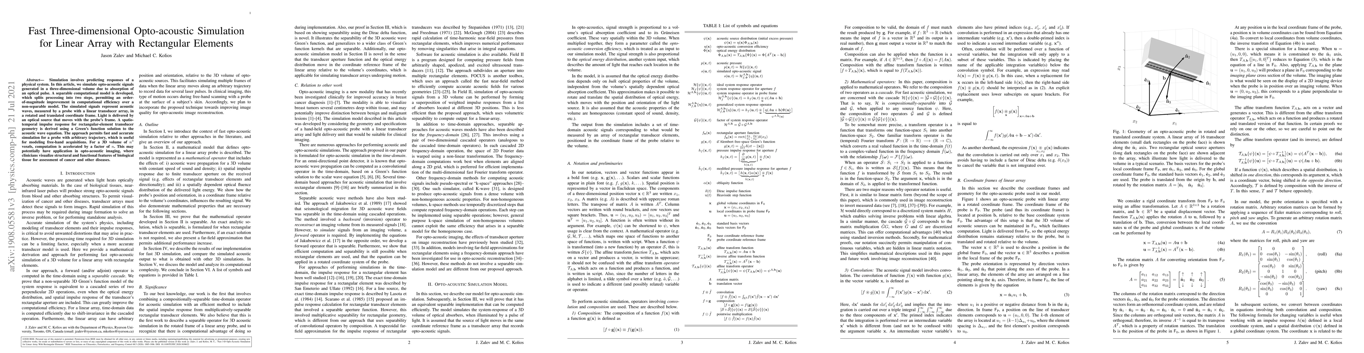 Simulation involves predicting responses of a physical system. In this article, we simulate opto-acoustic signals generated in a three-dimensional volume due to absorption of an optical pulse. A separable computational model is developed that permits an order-of-magnitude improvement in computational efficiency over a non-separable model. The simulated signals represent acoustic waves, measured by a probe with a linear transducer array, in a rotated and translated coordinate frame. Light is delivered by an optical source that moves with the probe's frame. A spatio-temporal impulse response for rectangular element transducer geometry is derived using a Green's function solution to the acoustic wave equation. The approach permits fast and accurate simulation for a probe with arbitrary trajectory. For a 3D volume of $n^3$ voxels, computation is accelerated by a factor of $n$. This may potentially have application for opto-acoustic imaging, where clinicians visualize structural and functional features of biological tissue for assessment of cancer and other diseases.