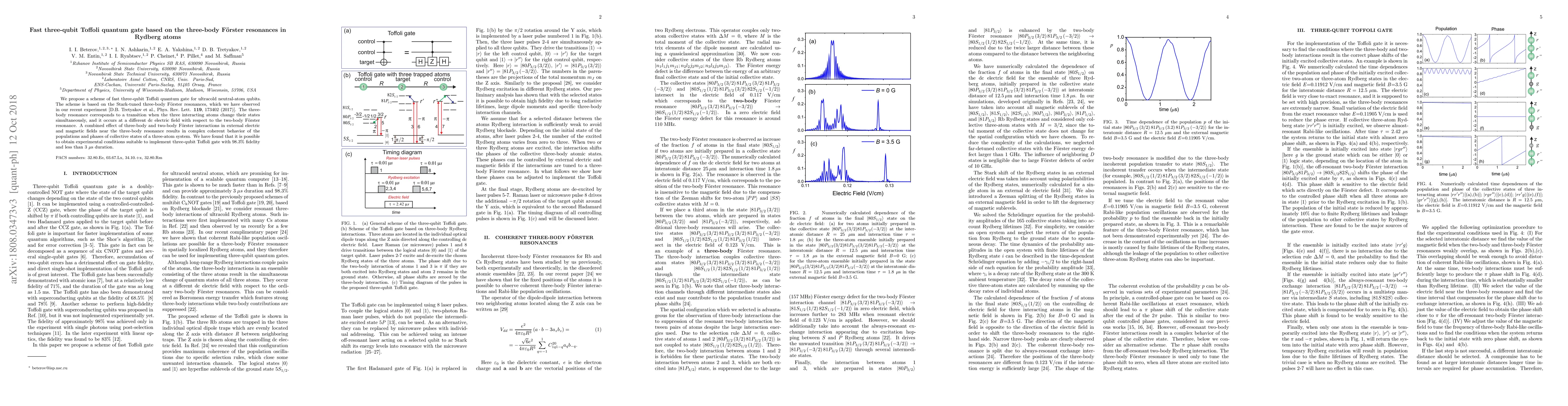 We propose a scheme of fast three-qubit Toffoli quantum gate for ultracold neutral-atom qubits. The scheme is based on the Stark-tuned three-body F\"{o}rster resonances, which we have observed in our recent experiment [D.B.Tretyakov et al., Phys.Rev.Lett. 119, 173402 (2017)]. The three-body resonance corresponds to a transition when the three interacting atoms change their states simultaneously, and it occurs at a different dc electric field with respect to the two-body F\"{o}rster resonance. A combined effect of three-body and two-body F\"{o}rster interactions in external electric and magnetic fields near the three-body resonance results in complex coherent behavior of the populations and phases of collective states of a three-atom system. We have found that it is possible to obtain experimental conditions suitable to implement three-qubit Toffoli gate with 96.8\% fidelity and less than 3~$\mu$s duration.
