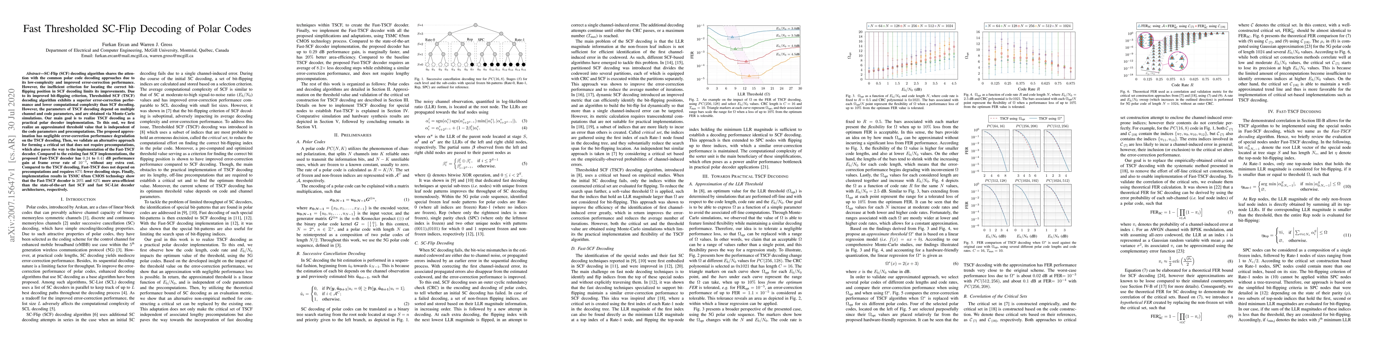 The paper proposes a Fast Thresholded SC-Flip (Fast-TSCF) decoding algorithm for polar codes that achieves improved error-correction performance and lower computational complexity compared to existing fast SC-Flip (SCF) implementations. The Fast-TSCF decoder uses an approximated threshold value independent of code parameters, resulting in negligible performance degradation and significant reductions in decoding steps and area efficiency.