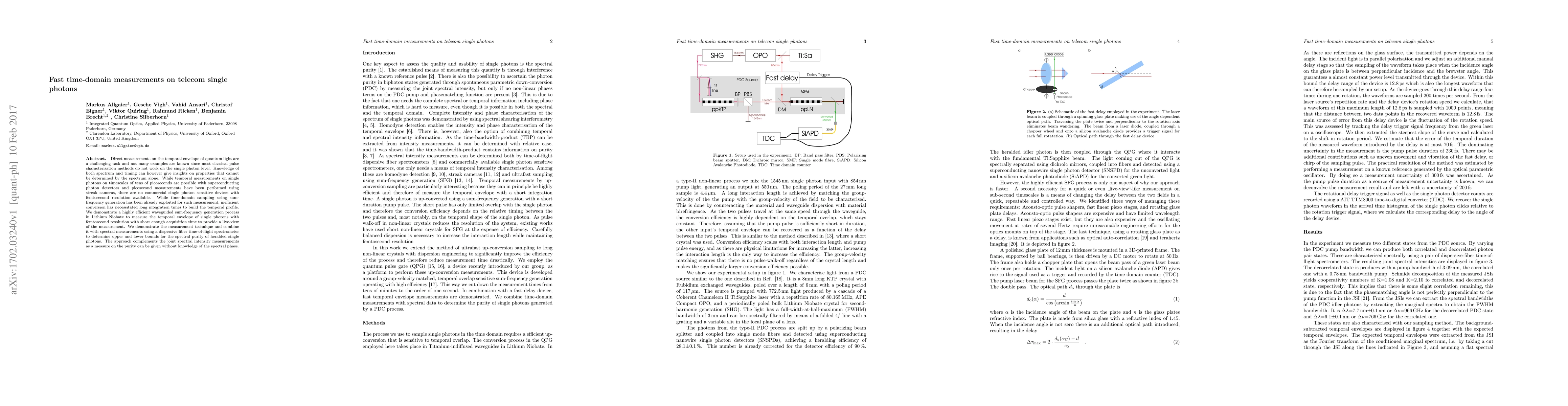 This paper presents a highly efficient waveguided sum-frequency generation method in Lithium Niobate for femtosecond resolution time-domain measurements on telecom single photons, enabling live-view temporal profiles. It also combines this technique with spectral measurements to assess the spectral purity of heralded single photons, providing a complementary approach to joint spectral intensity measurements.