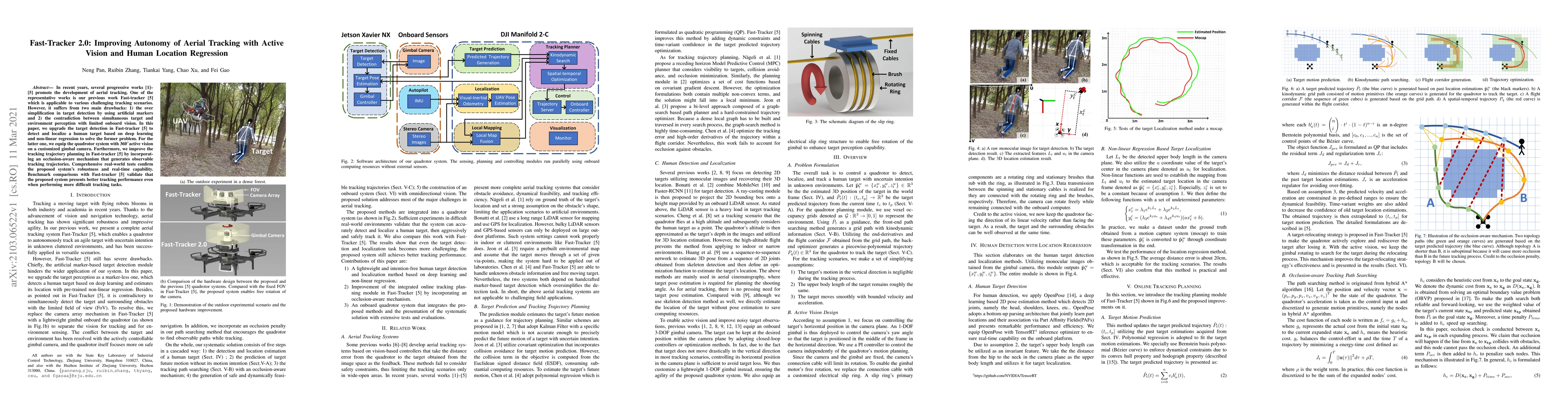 In recent years, several progressive works promote the development of aerial tracking. One of the representative works is our previous work Fast-tracker which is applicable to various challenging tracking scenarios. However, it suffers from two main drawbacks: 1) the over simplification in target detection by using artificial markers and 2) the contradiction between simultaneous target and environment perception with limited onboard vision. In this paper, we upgrade the target detection in Fast-tracker to detect and localize a human target based on deep learning and non-linear regression to solve the former problem. For the latter one, we equip the quadrotor system with 360 degree active vision on a customized gimbal camera. Furthermore, we improve the tracking trajectory planning in Fast-tracker by incorporating an occlusion-aware mechanism that generates observable tracking trajectories. Comprehensive real-world tests confirm the proposed system's robustness and real-time capability. Benchmark comparisons with Fast-tracker validate that the proposed system presents better tracking performance even when performing more difficult tracking tasks.