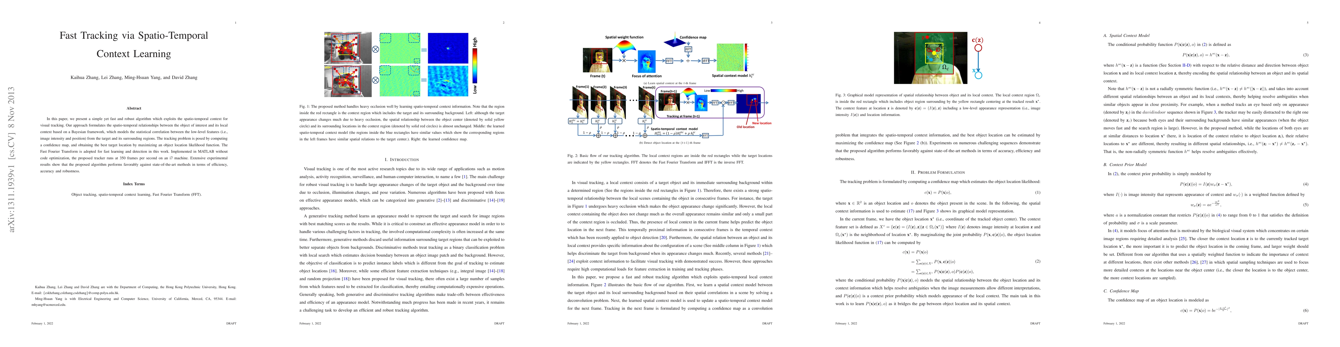 This paper introduces a fast and robust visual tracking algorithm that leverages spatio-temporal context through a Bayesian framework. It uses the Fast Fourier Transform for efficient learning and detection, achieving 350 frames per second on an i7 machine, and demonstrates superior efficiency, accuracy, and robustness compared to state-of-the-art methods.