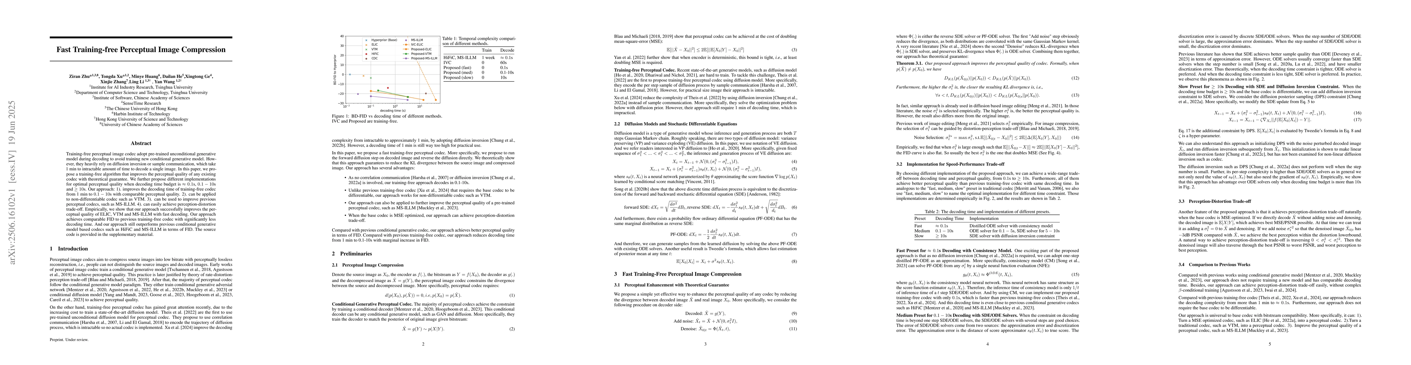 Training-free perceptual image codec adopt pre-trained unconditional generative model during decoding to avoid training new conditional generative model. However, they heavily rely on diffusion inversion or sample communication, which take 1 min to intractable amount of time to decode a single image. In this paper, we propose a training-free algorithm that improves the perceptual quality of any existing codec with theoretical guarantee. We further propose different implementations for optimal perceptual quality when decoding time budget is $\approx 0.1$s, $0.1-10$s and $\ge 10$s. Our approach: 1). improves the decoding time of training-free codec from 1 min to $0.1-10$s with comparable perceptual quality. 2). can be applied to non-differentiable codec such as VTM. 3). can be used to improve previous perceptual codecs, such as MS-ILLM. 4). can easily achieve perception-distortion trade-off. Empirically, we show that our approach successfully improves the perceptual quality of ELIC, VTM and MS-ILLM with fast decoding. Our approach achieves comparable FID to previous training-free codec with significantly less decoding time. And our approach still outperforms previous conditional generative model based codecs such as HiFiC and MS-ILLM in terms of FID. The source code is provided in the supplementary material.