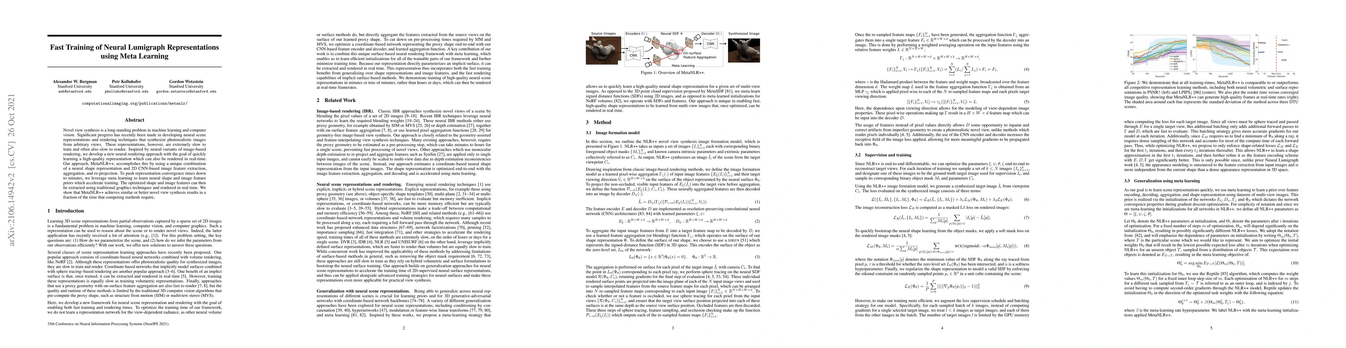 This paper introduces MetaNLR++, a novel neural rendering method that combines neural shape representations with 2D CNNs for fast training and real-time rendering. By employing meta learning to accelerate the learning of shape and image feature priors, it achieves high-quality novel view synthesis significantly faster than existing methods.